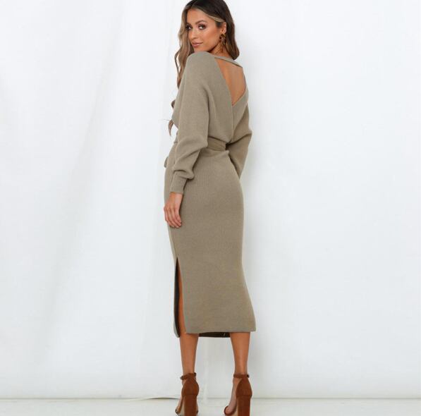 大人可愛いニットワンピース|ボリューム袖のVネック!