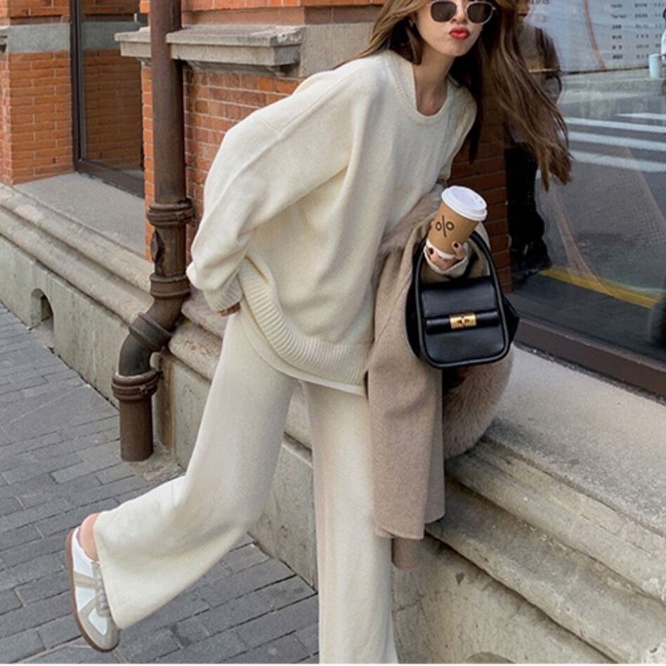 長袖のクルーネックセーターとウエストゴムのロングパンツは、秋冬のコーディネートにぴったりのアイテムです。