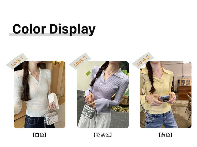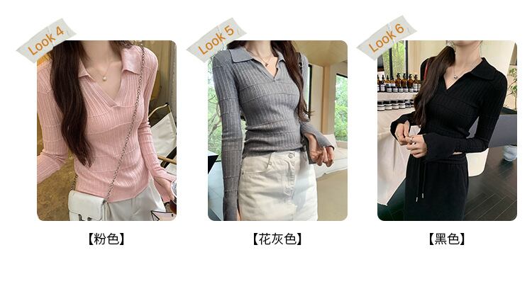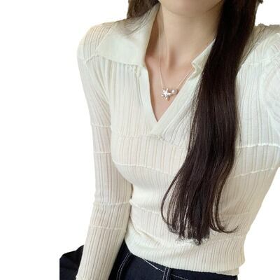 Vネックの襟付きデザインとフレアスリーブが女性らしさを引き立て、タイトでスリムなシルエットは美しいラインを演出します。リブニットの伸縮性は、快適さを確保しつつも、コンサバで上品な印象を与えます。シンプルながらもエレガントな雰囲気を醸し出すこのセーターは、オフィスやデート、お出かけなどさまざまなシーンで大活躍すること間違いなしです!