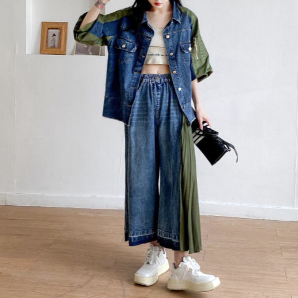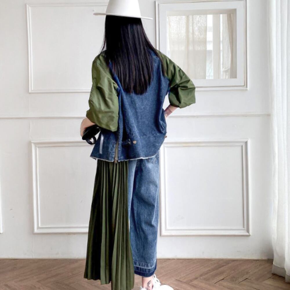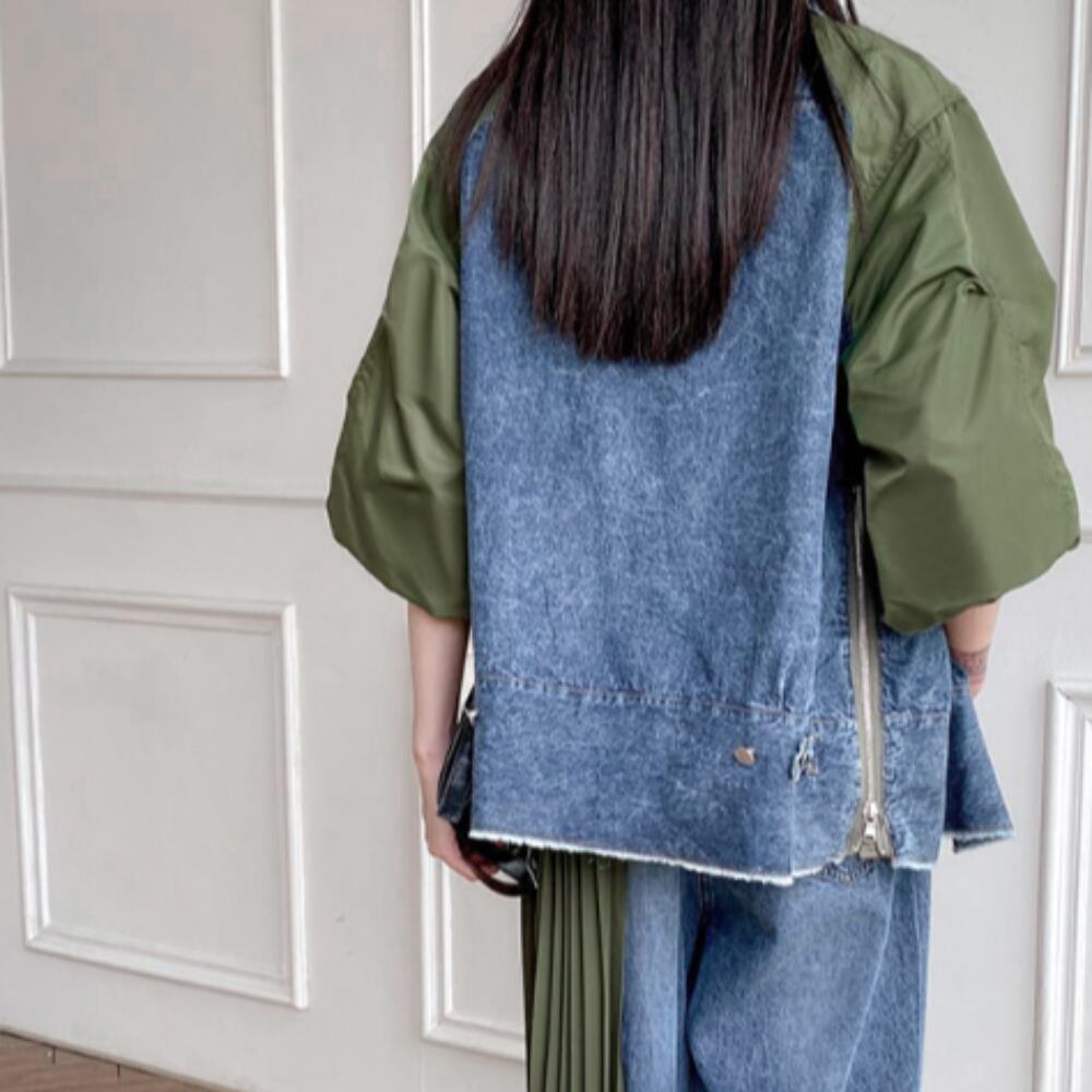 レディース 切り替えデザイン バイカラー ジャケット Gジャン デニムジャケット 長袖 オーバーサイズ ハイウエスト アメカジ デニム ブルーデニム かわいい シンプル カジュアル おしゃれ かっこいい こなれ感 ラフ 個性的 クール 抜け感 アメリカン アクティブ ワイルド セクシー 無地 秋 冬 デート お出かけ 旅行 休日 ライブ 楽ちん 体型カバー 普段使い スタイルアップ ゆったり ゆる グリーン フリーサイズ