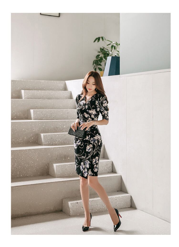 ドレス パーティー ステージ 舞台 キャバ 衣装 ラウンジ クラブ ミディアム丈 5分袖 Vネック タイト スリム 細身 Iライン 大人可愛い 上品 おしゃれ エレガント 主役級 存在感 華やか 花柄 イベント ホテル レストラン 女子会 春 夏 秋 冬 シーズンレス S M L XL
