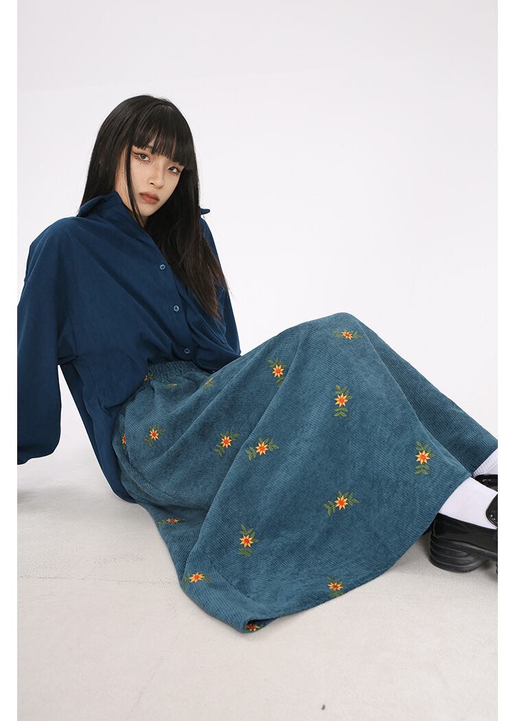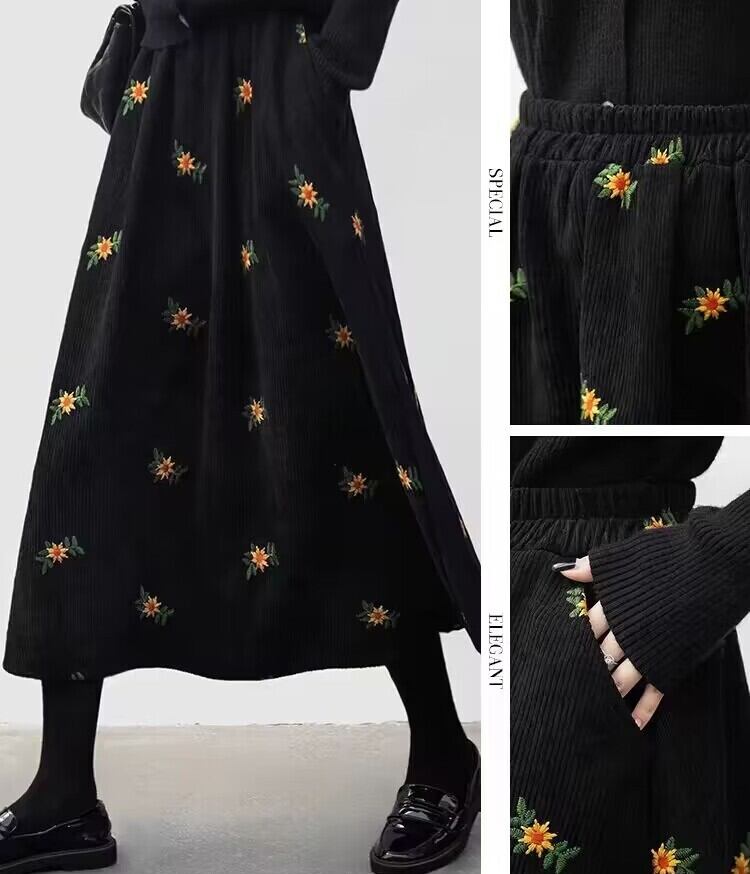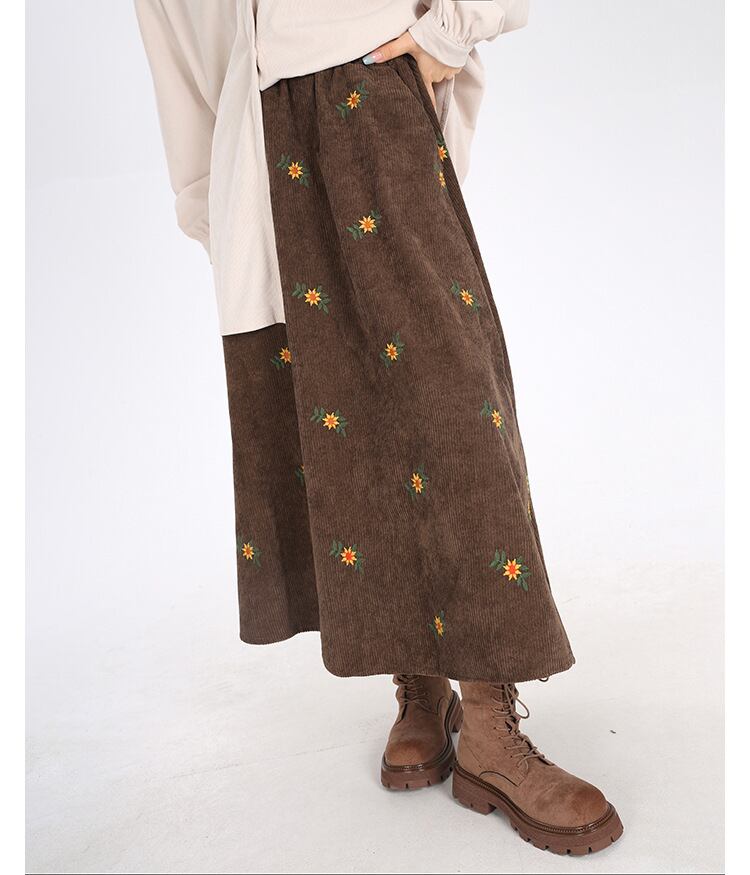 レディース スカート カラースカート フレアスカート 膝下 ミモレ ミドル丈 フレア Aライン 刺繍 ポケット ウエストゴム かわいい 大人可愛い カジュアル おしゃれ こなれ感 レトロ ガーリー キュート 抜け感 ベーシック ナチュラル 花柄 秋 冬 ママ 学生 学校 通学 デート お出かけ 旅行 女子会 休日 ショッピング カフェ 楽ちん 普段使い 着回し 体型カバー フリーサイズ 黑 ブラック 茶色 ブラウン ブルー ベーシックカラー 秋カラー