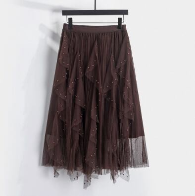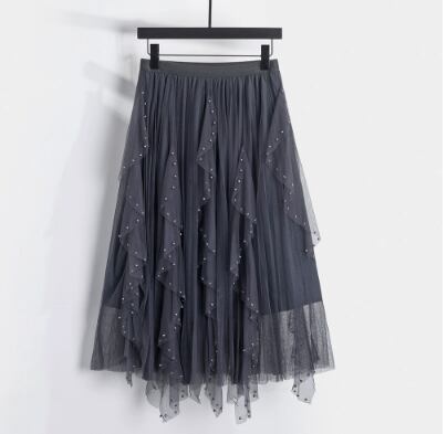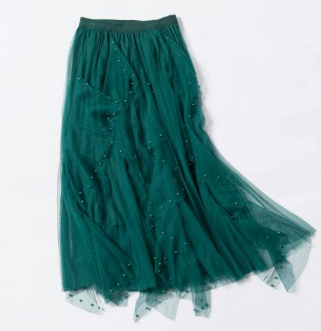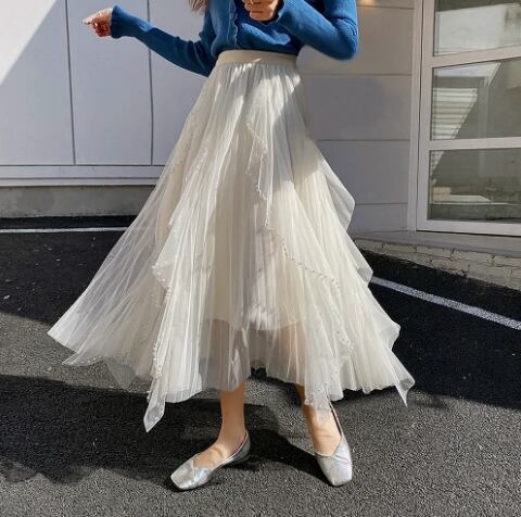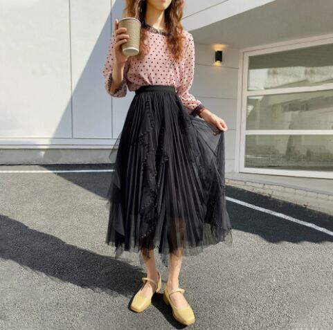 ふんわりと広がるチュールが軽やかに揺れる、ミモレ丈のチュールスカート。