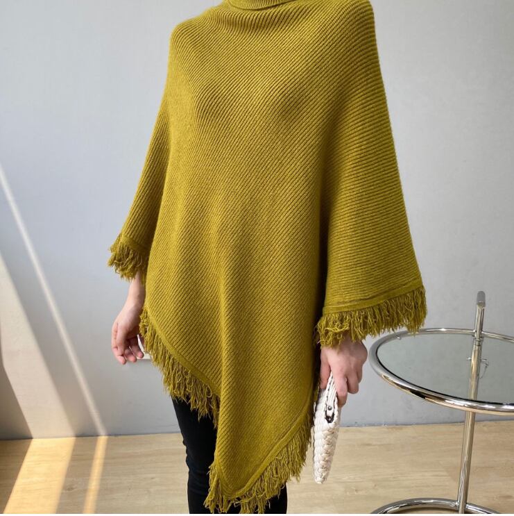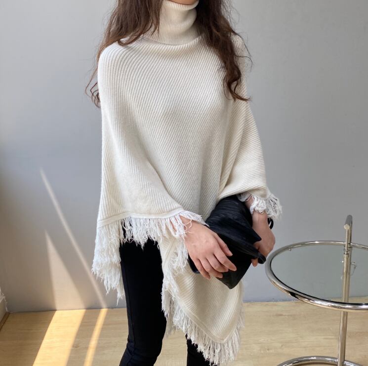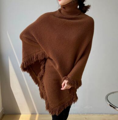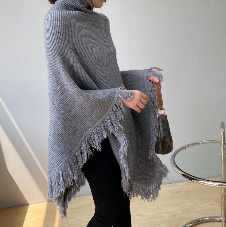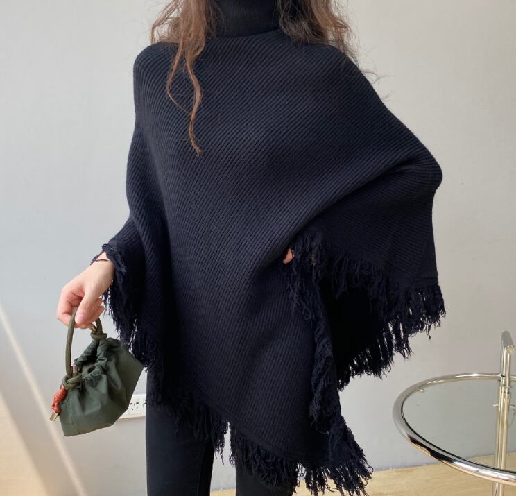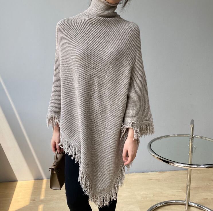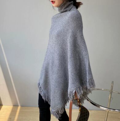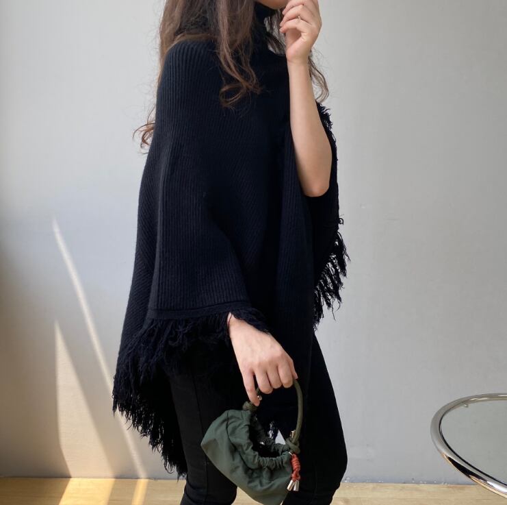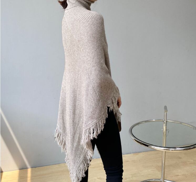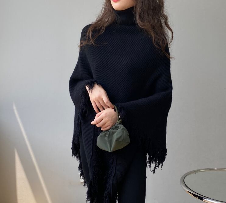 ゆるやかなシルエットが魅力のタートルネックポンチョニット。