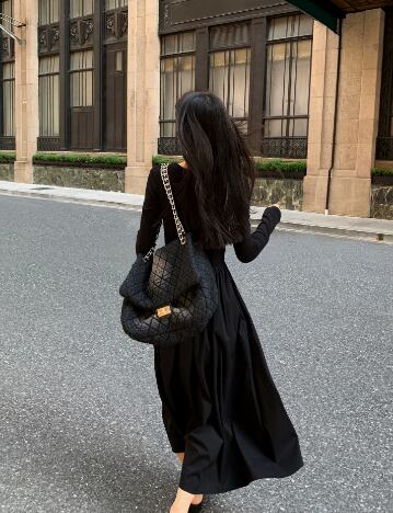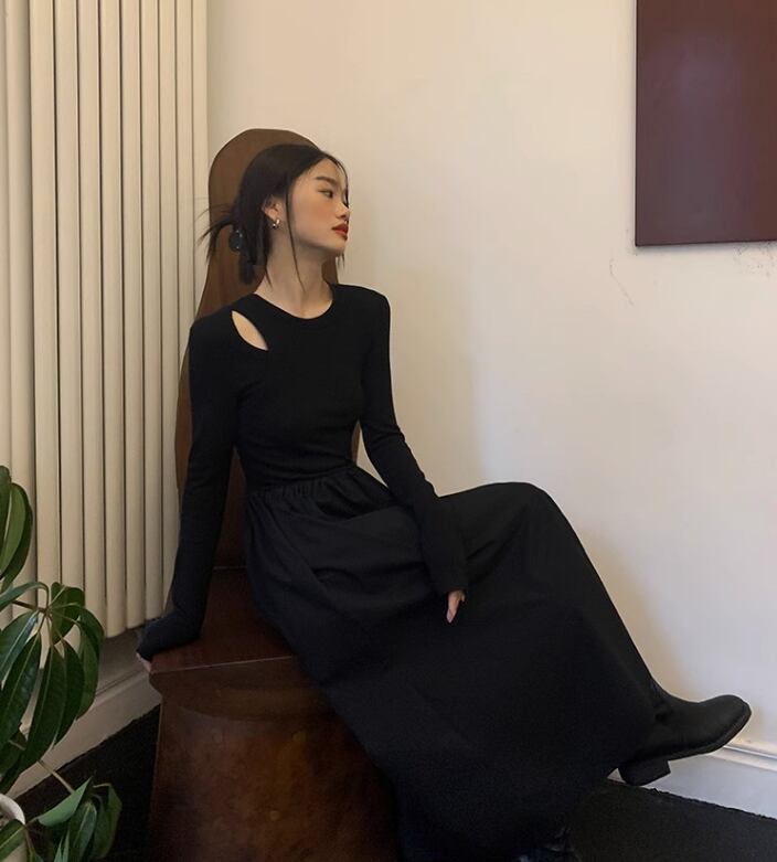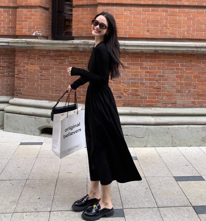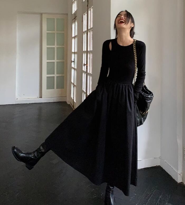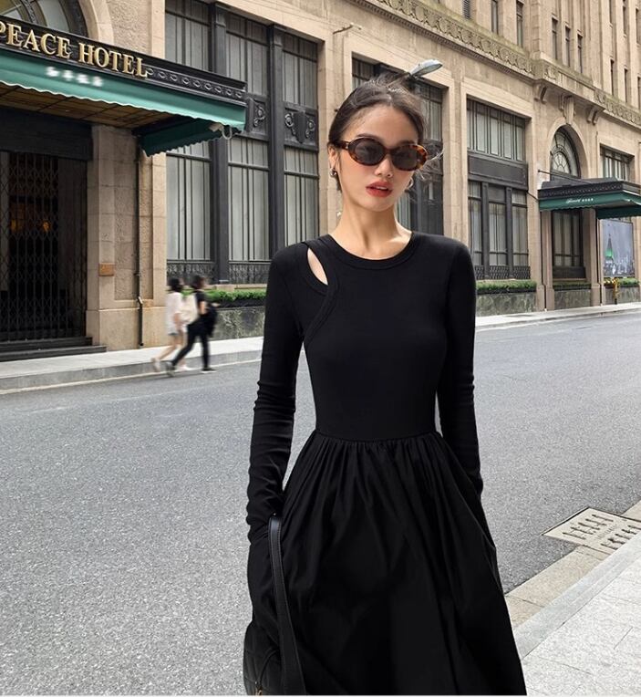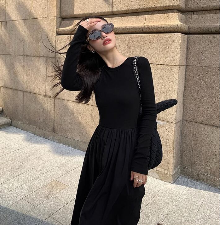レディース ワンピース プルオーバー ロング 長袖 ラウンドネック 襟なし Aライン 切り替えデザイン きれいめ シンプル カジュアル 上品 おしゃれ こなれ感 ラフ クール モード系 エレガント モダン 主役級 存在感 都会的 ベーシック ナチュラル 無地 春 秋 デート お出かけ 女子会 休日 カフェ 韓国 オルチャン コーデ 楽ちん 普段使い 着回し モテ 清楚 トレンド 流行 インスタ映え 定番 スタイルアップ S M L XL サイズ豊富 黒 ブラック ベーシックカラー 大人カラー