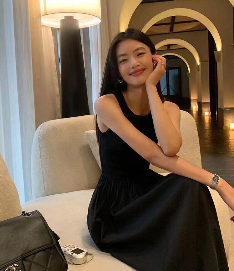 シンプルな美しさが際立つノースリーブロングワンピース。