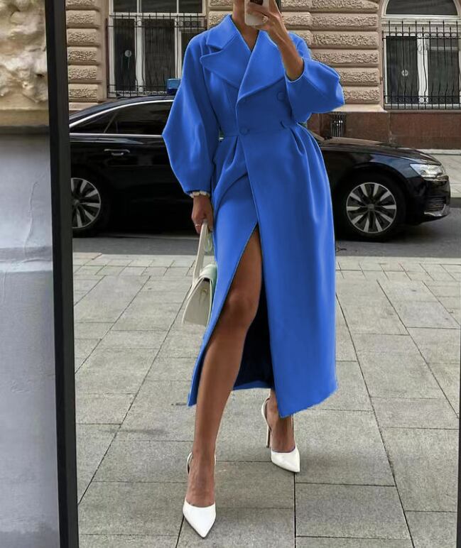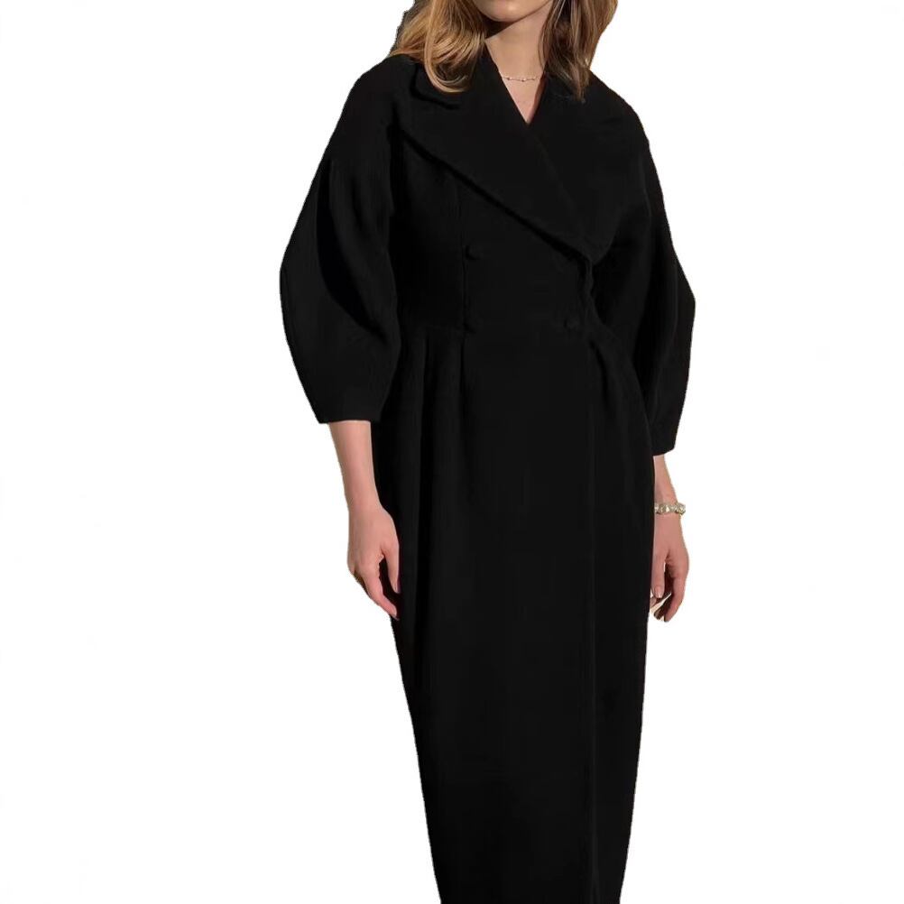 上品さと個性を兼ね備えた、レディースロングコート。ランタンスリーブと襟付きラペルが、シックでありながらも華やかな雰囲気を演出します。タイトなシルエットが美しいラインを作り出し、秋冬のコーディネートに最適なアイテムです。ハイウエストデザインとダブルブレストの仕様で、エレガントな印象を与えながらもスタイリッシュに決まります。