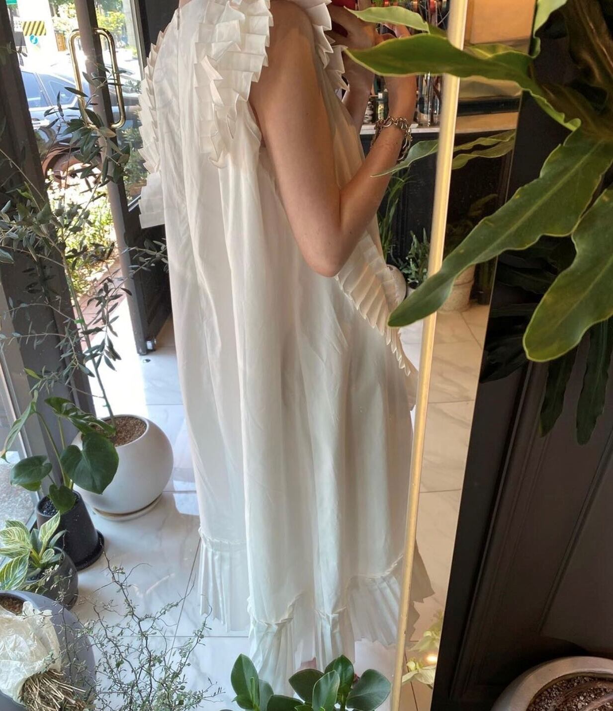 ラウンドネックとフリルのデザインが特徴で、アシンメトリーなシルエットが個性的!