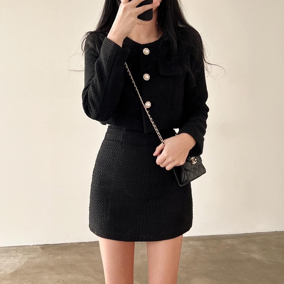 2点セット セットアップ ジャケット 長袖 クルーネック 前開き デザインボタン ショート丈 ミニスカート ハイウエスト Aライン 可愛い かわいい 大人可愛い きれいめ シンプル 上品 おしゃれ レトロ かっこいい カジュアル こなれ感 個性的 主役級 存在感 抜け感 ベーシック ナチュラル キュート フォーマル 無地 女性用 レディース OL 通勤 学生 通学 デート お出かけ お泊まり 女子会 旅行 休日 カフェ ショッピング 普段使い デイリー イベント 着回し 重ね着 脚長 S M トレンド