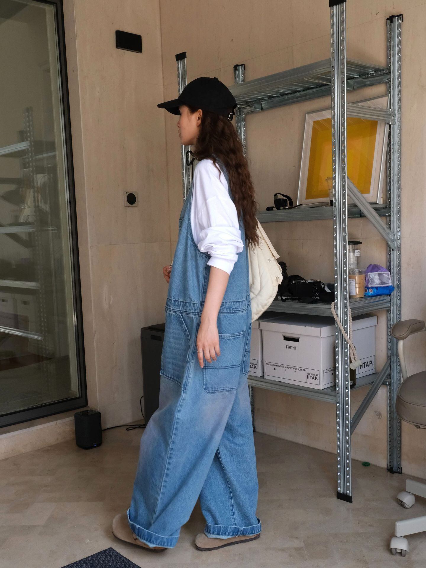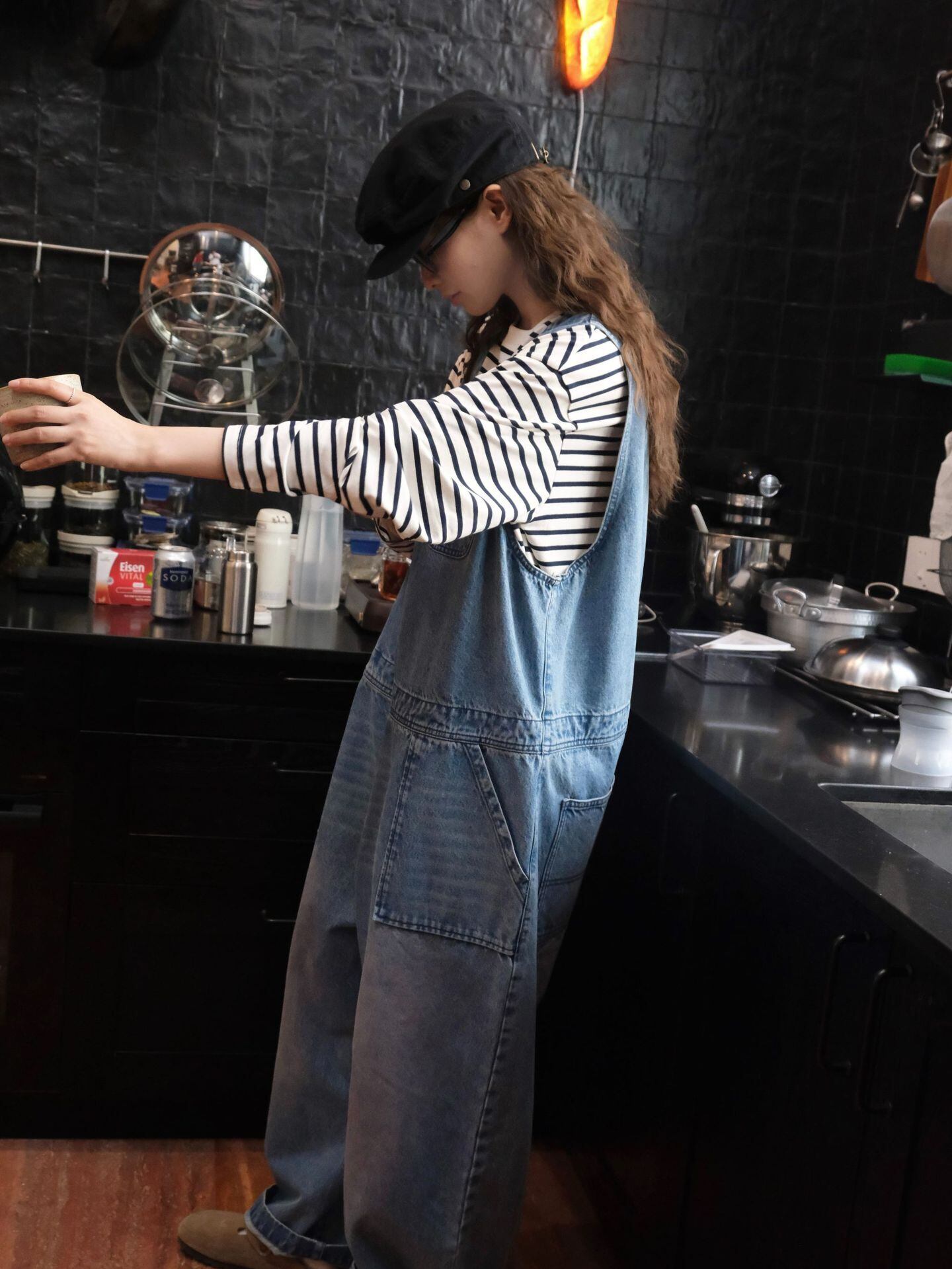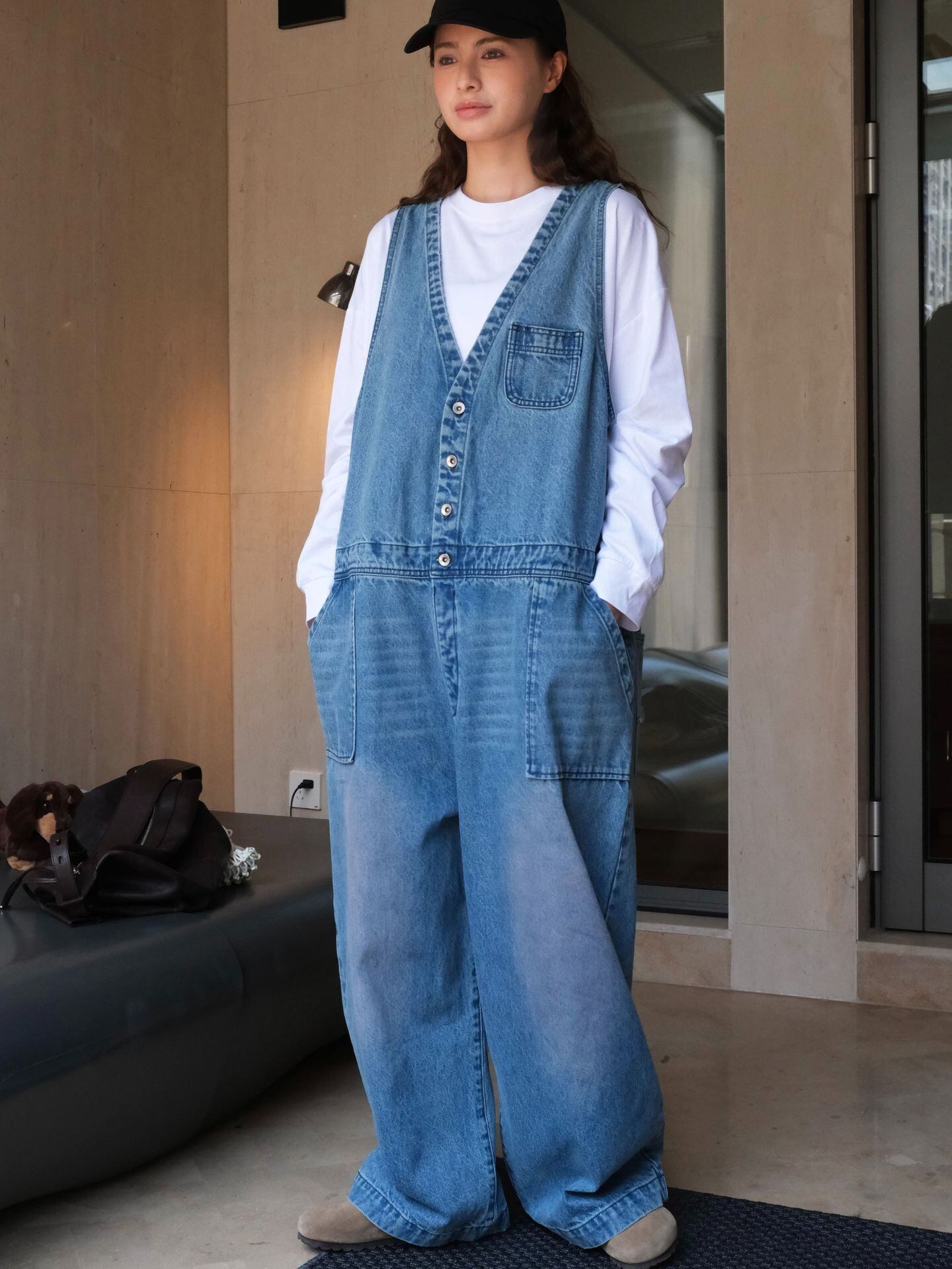 こなれ感たっぷりのブルーデニムサロペット。Vネックのノースリーブデザインがすっきりとした印象を与え、ワイドなシルエットがリラックス感とトレンド感を両立します。オーバーサイズながらも程よく体に馴染み、動きやすさも抜群。