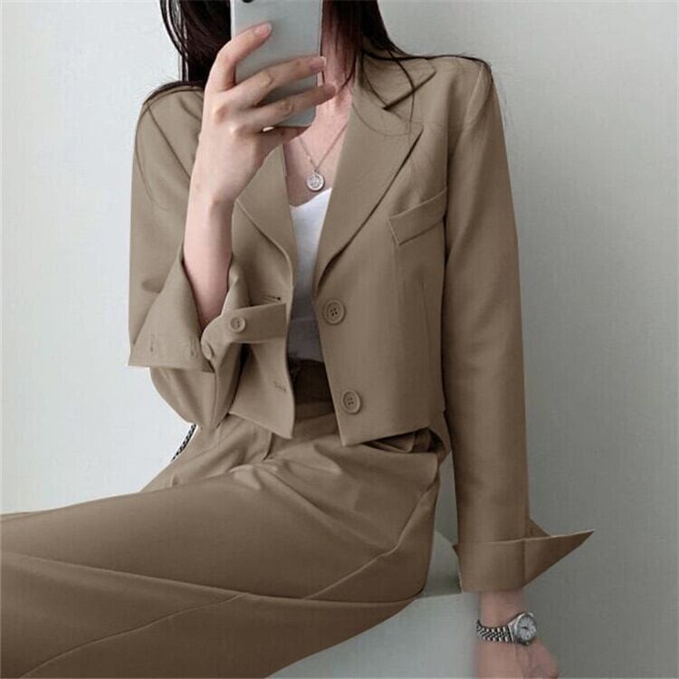 2点セット セットアップ スーツ ジャケット 長袖 襟付き 前開き ボタン 胸ポケット ショート丈 ロングパンツ ハイウエスト 可愛い かわいい 大人可愛い きれいめ シンプル 上品 おしゃれ レトロ かっこいい カジュアル こなれ感 個性的 主役級 存在感 抜け感 ベーシック ナチュラル メンズライク 無地 女性用 レディース OL 通勤 学生 通学 デート お出かけ お泊まり 女子会 旅行 休日 カフェ ショッピング 普段使い デイリー イベント 着回し 重ね着 脚長 S M L XL 2XL 3XL