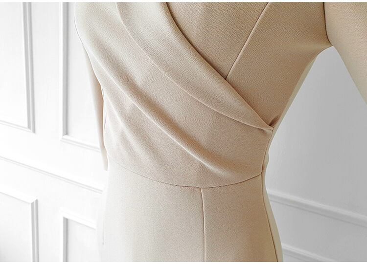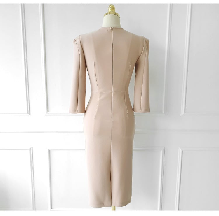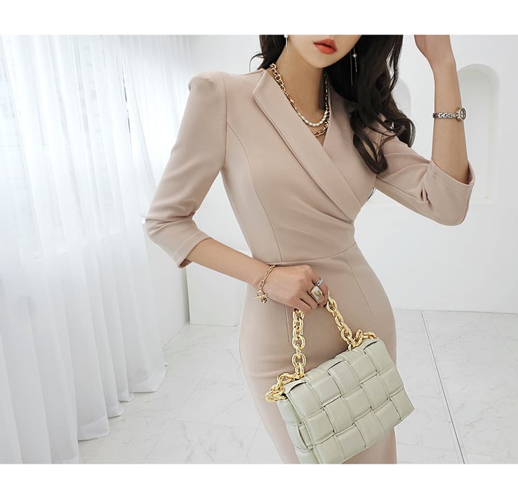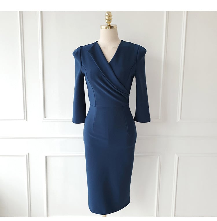 パワーショルダー ドレス ワンピース パーティー 発表会 ステージ 舞台 キャバ 衣装 ラウンジ クラブ ミディアム丈 7分袖 Vネック カシュクール 襟付き タイト スリム 細身 Iライン スリット きれいめ シンプル 大人可愛い 上品 おしゃれ クール エレガント 存在感 清楚 無地 イベント ホテル レストラン 女子会 春 夏 秋 冬 シーズンレス S M L XL