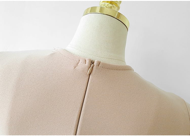 洗練された印象を放つ、襟付きVネックのミディアム丈ドレス。上品なタイトシルエットが女性らしいラインを美しく引き立て、スリット入りのデザインが動きにエレガントな抜け感をプラスします。7分袖で季節を問わず着こなせるのも魅力。