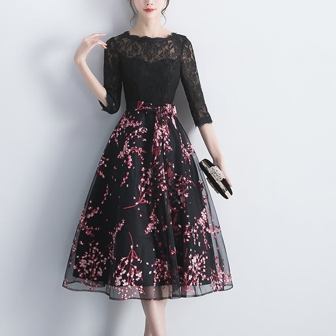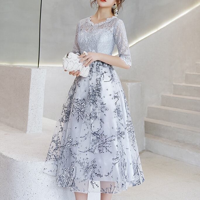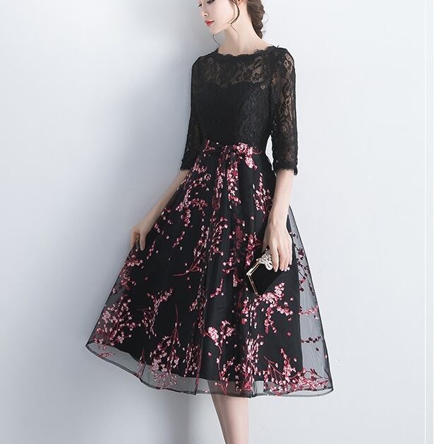 このミディアム丈のカクテルドレスは、5分袖デザインに美しい刺繍と透かし編みが施されており、大人可愛い印象を与えます。