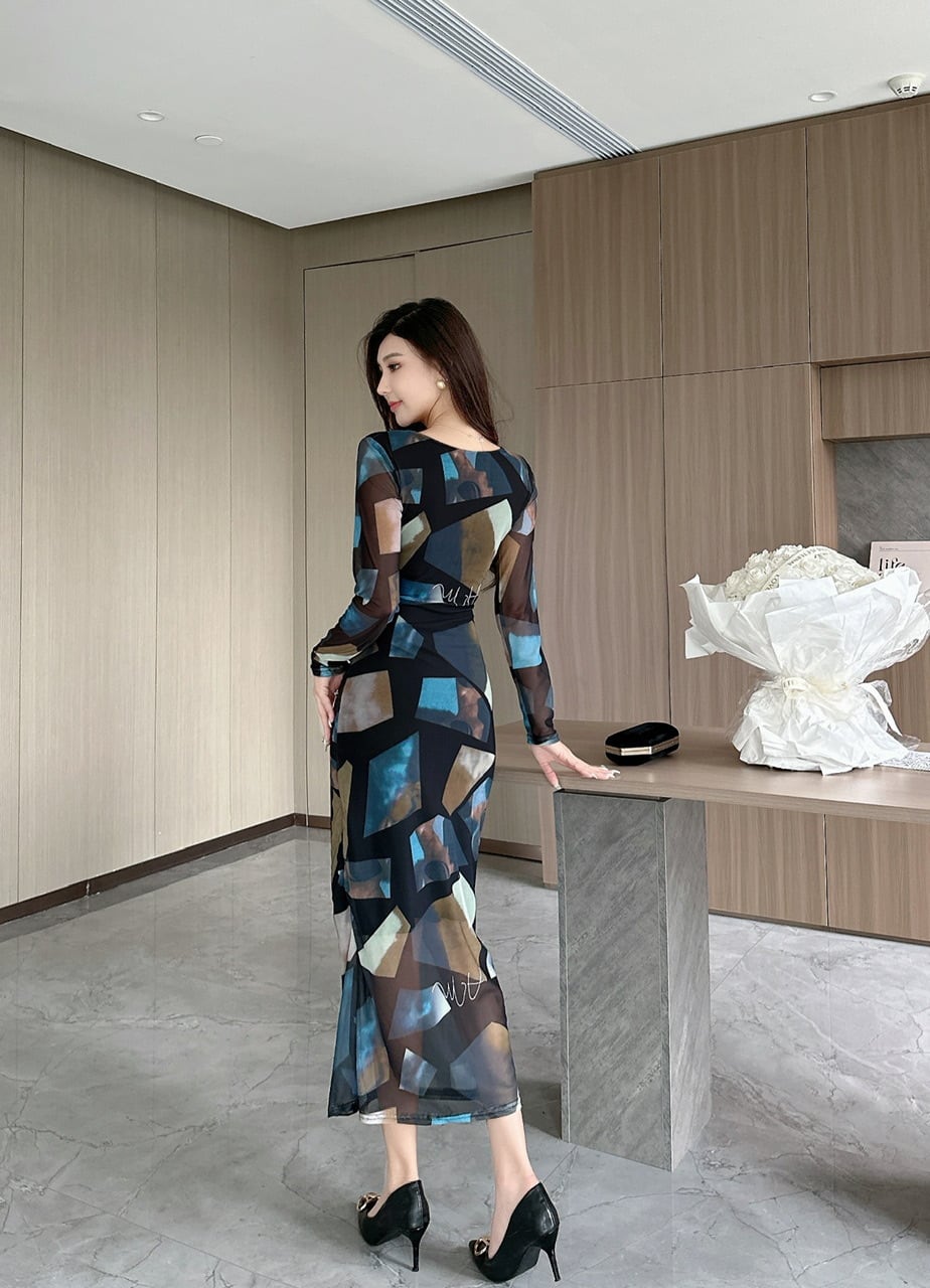 流れるようなIラインシルエットが美しい、Vネックのタイトドレス。計算されたカッティングがボディラインを上品に引き立て、どんな角度から見てもエレガントな印象を演出します。長袖デザインで季節を問わず着用でき、春夏秋冬いつでも華やかなシーンにマッチ。