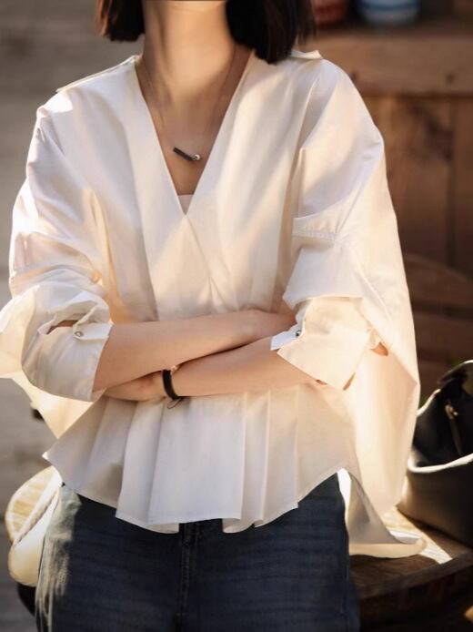 春から冬まで使える、レディース トップス シャツ ブラウスが登場!レギュラー丈で長袖のVネックデザインが特徴で、カジュアルさとおしゃれさを見事に両立させています。Aラインのアシンメトリーシルエットが美しいフレアを生み出し、裾のワイド感やプリーツ、タックがほどよい動きを与えます。ウエストマークのギャザーが女性らしいラインを強調し、シンプルながらも存在感のある一着です。無地でありながらも、そのデザイン性は個性的で、大人可愛い印象を与えてくれます。