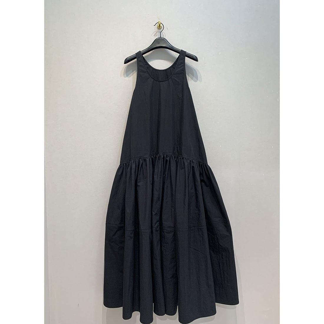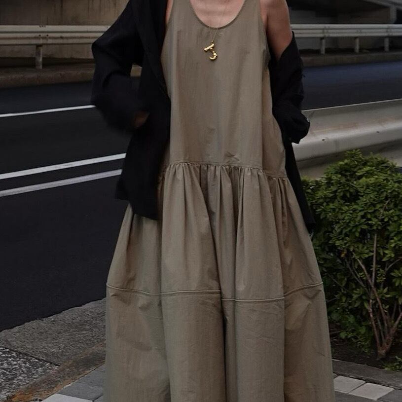 深めのUネックとノースリーブ、ゆったりとしたAラインのデザインで