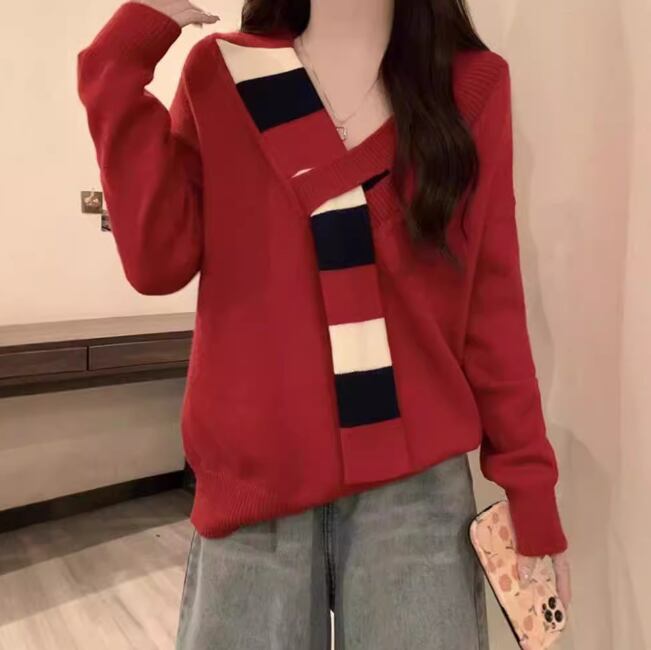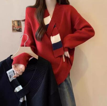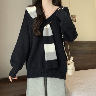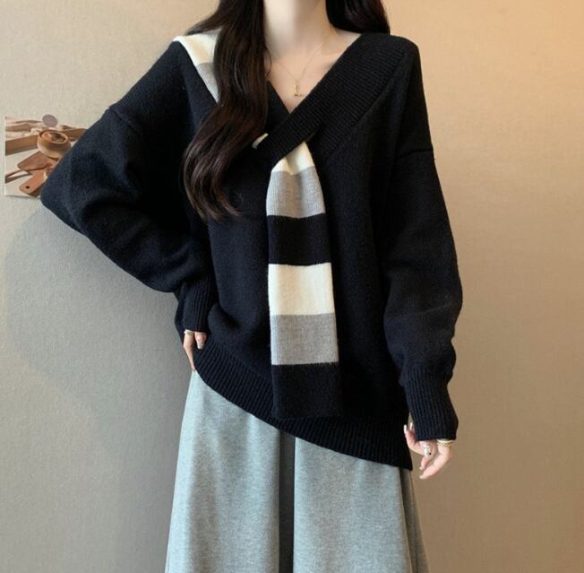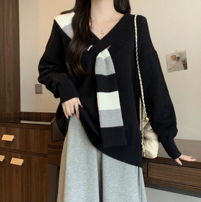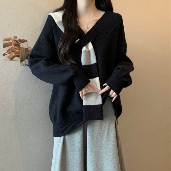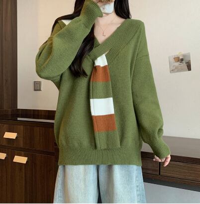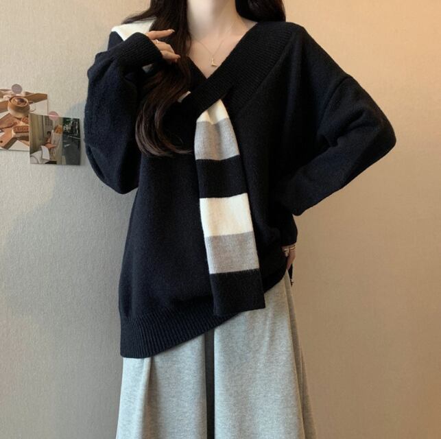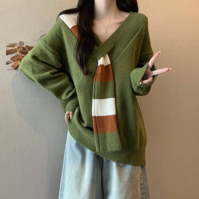 レディース トップス ニット セーター 長袖 Vネック フェイクススカーフ ワイド ニット きれいめ シンプル カジュアル おしゃれ こなれ感 ラフ エレガント モダン 主役級 存在感 都会的 ベーシック ナチュラル 無地 秋 冬 デート お出かけ 公園 女子会 休日 ショッピング カフェ コーデ 楽ちん 普段使い 着回し モテ 清楚 トレンド 流行 インスタ映え 定番 スタイルアップ ゆったり フリーサイズ ワンサイズ ブラック レッド グリーン ベーシックカラー 大人カラー カラバリ