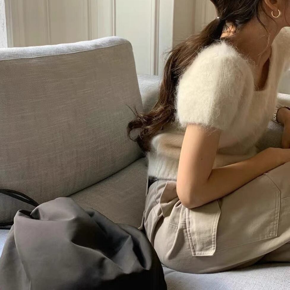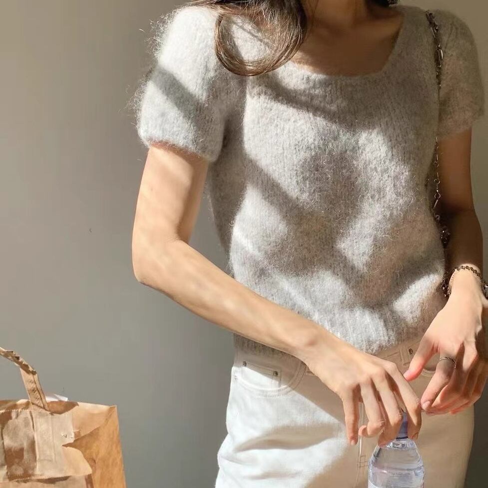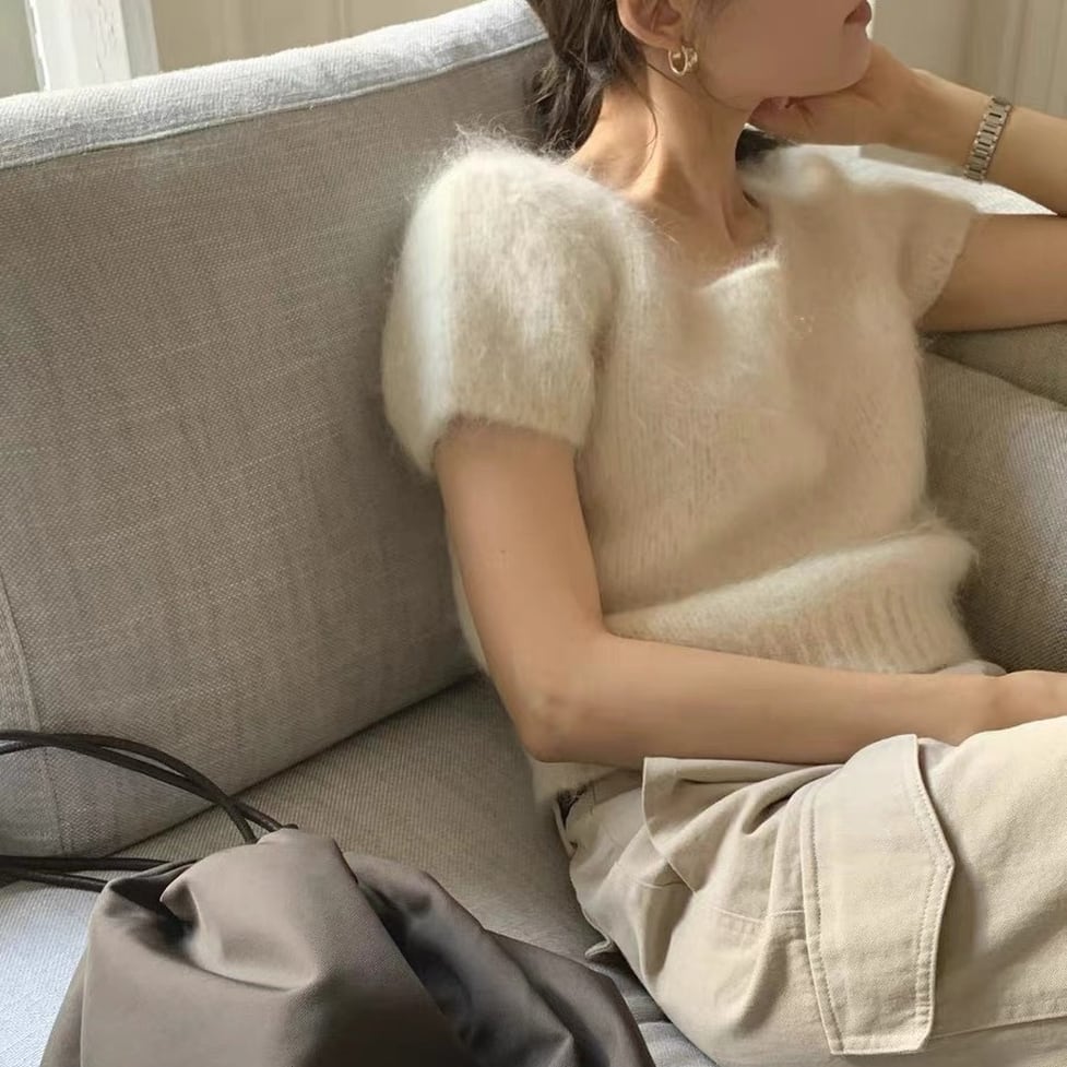 大人可愛いコンパクトな半袖ニット。何気ない所作を優雅に見せるのでオンオフ問わず活躍しそう。顔まわりに華やぎだけを的確に添えるスマートな洒落感が実現。何度だって新鮮な気持ちで着まわしたい服。