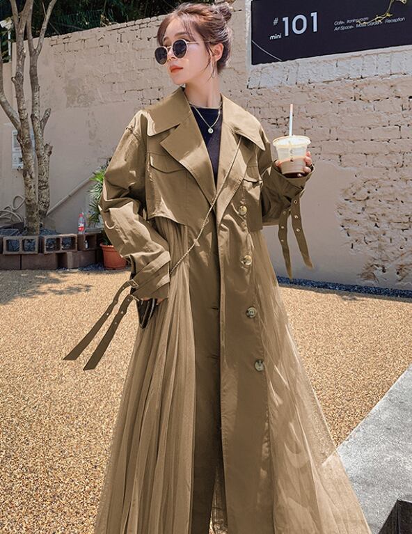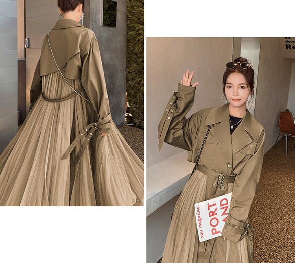 レディース コート トレンチ ロング 長袖 レギュラースリーブ ラペル フレア Aライン 切り替え プリーツ タック チュール ハイウエスト 透け感 切り替えデザイン スパンデックス ポリエステル スプライシング 大人可愛い おしゃれ 個性的 存在感 無地 春 秋 通勤 デート お出かけ イベント リゾート 旅行 女子会 休日 バカンス ガーデン ショッピング 発表会 コンサート カフェ 重ね着 脚長 普段使い S M L XL カーキ