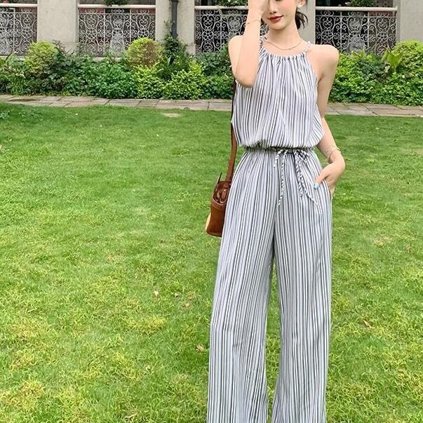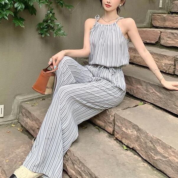 2点セット セットアップ ノースリーブ プルオーバー ショート丈 ロングパンツ ワイドパンツ ポケット ウエストゴム 可愛い かわいい 大人可愛い きれいめ シンプル 上品 おしゃれ レトロ かっこいい カジュアル こなれ感 個性的 主役級 存在感 抜け感 春 夏 ナチュラル ベーシック クール ストライプ柄 女性用 レディース ママ OL 通勤 オフィス デート お出かけ お泊まり 女子会 旅行 休日 カフェ ショッピング コンパ 普段使い デイリー イベント 着回し 重ね着 脚長 S M L XL