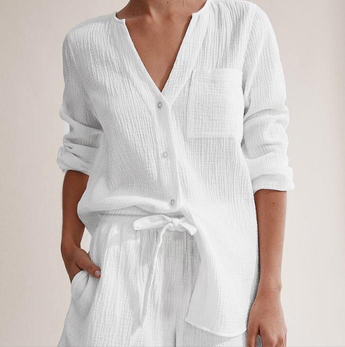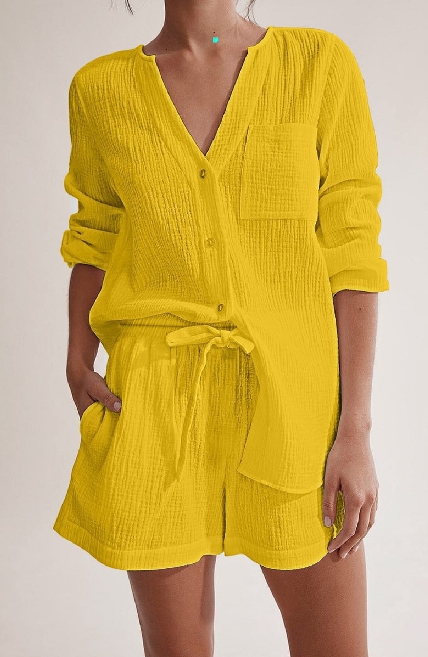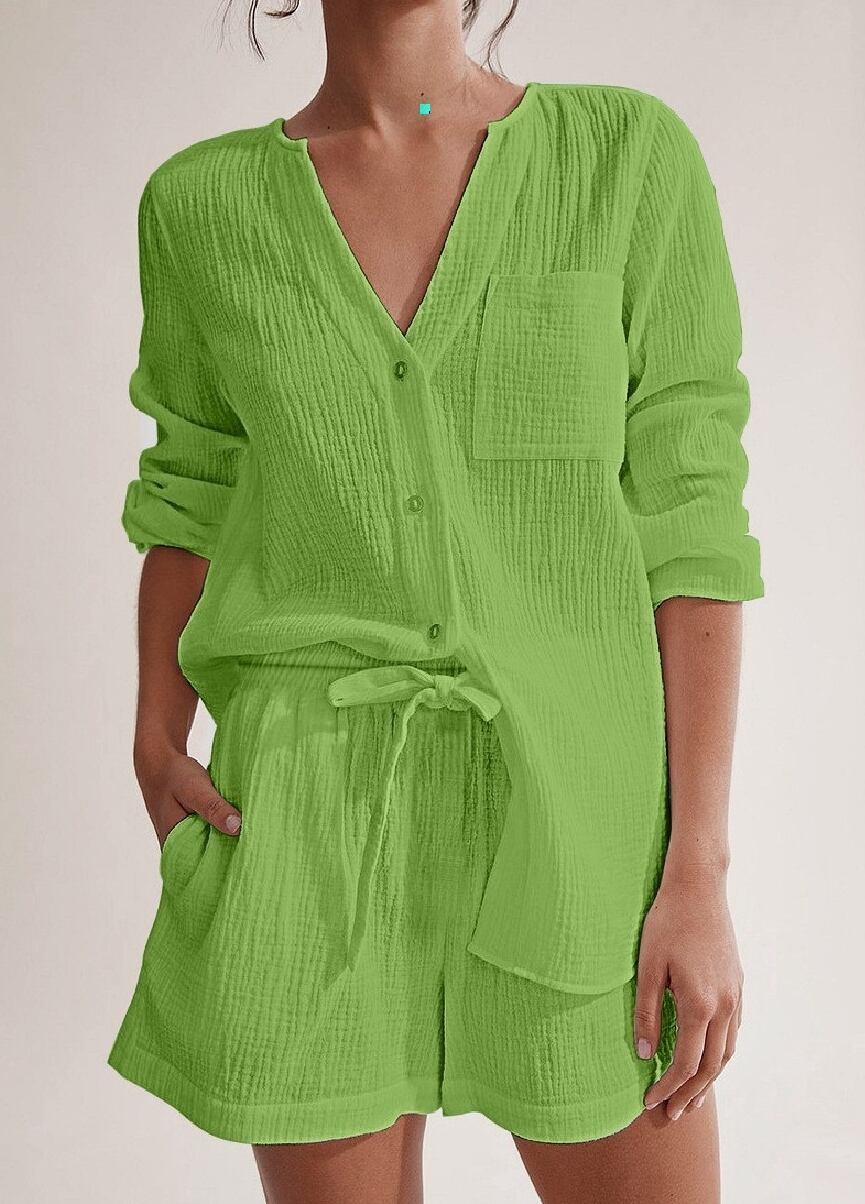 2点セット セットアップ シャツ 長袖 Vネック 前開き ボタン 胸ポケット ミディアム丈 ショートパンツ ウエストゴム ポケット 可愛い かわいい 大人可愛い きれいめ シンプル 上品 おしゃれ レトロ かっこいい カジュアル こなれ感 個性的 主役級 存在感 抜け感 ベーシック ナチュラル メンズライク 無地 女性用 レディース OL 通勤 学生 通学 デート お出かけ お泊まり 女子会 旅行 休日 カフェ ショッピング 普段使い デイリー イベント 着回し 重ね着 脚長 S M L トレンド モテ
