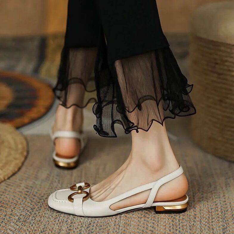 ローヒールとバックルが特徴で、シンプルながらも存在感抜群です
