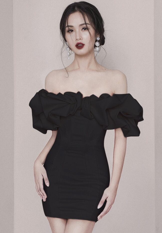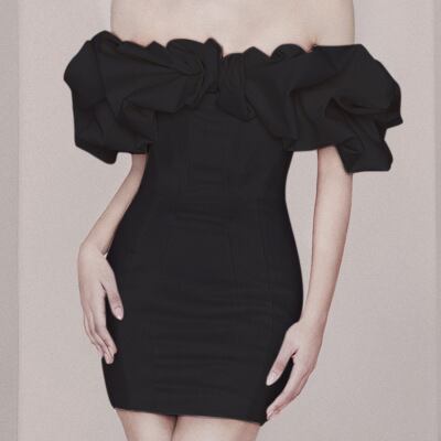 洗練されたオフショルダーのデザインは、肩を美しく魅せ、フリルが施されたタイトなシルエットが大人可愛い印象を与えます。