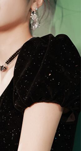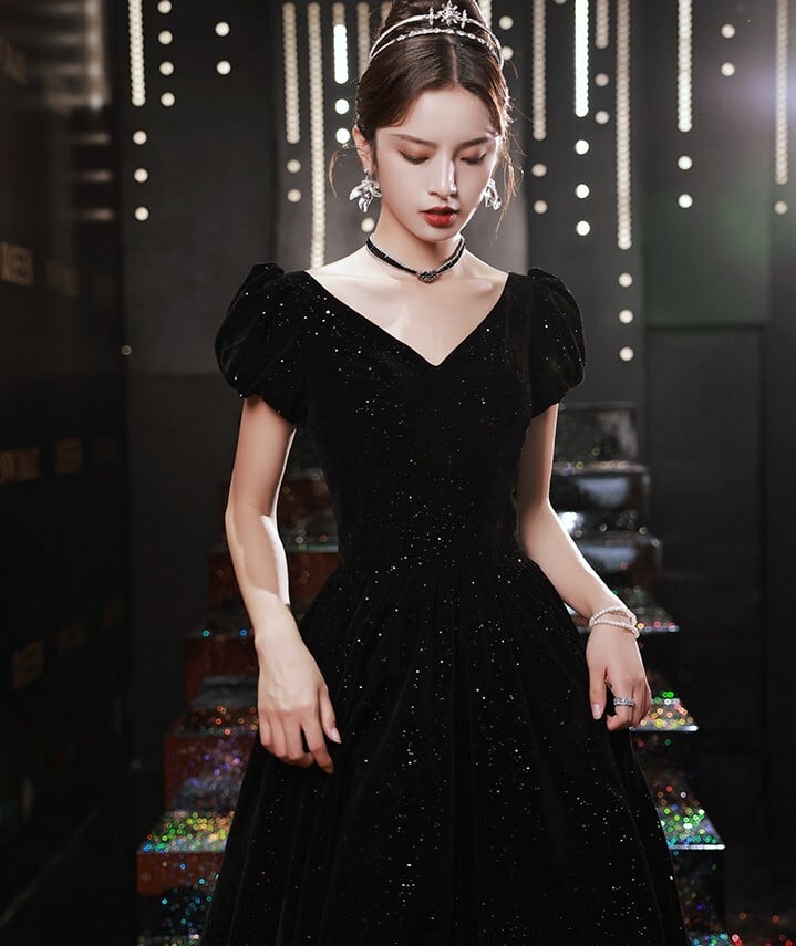 ドレス パーティー 発表会 ステージ 舞台 衣装 ミモレ 半袖 パフスリーブ Vネック Aライン バックコンシャス 可愛い きれいめ 大人可愛い 上品 キュート ガーリー エレガント 主役級 存在感 清楚 ゴージャス シック 無地 イベント 二の腕カバー 女子会 光沢感 秋 冬 XS 2XL 3XL 4XL 小さい 大きい S M L XL ブラック