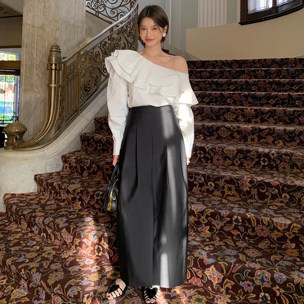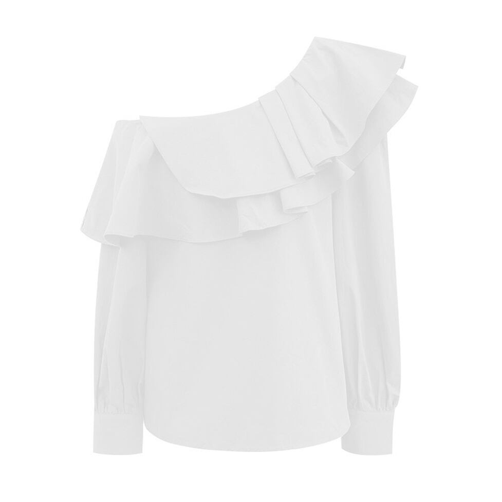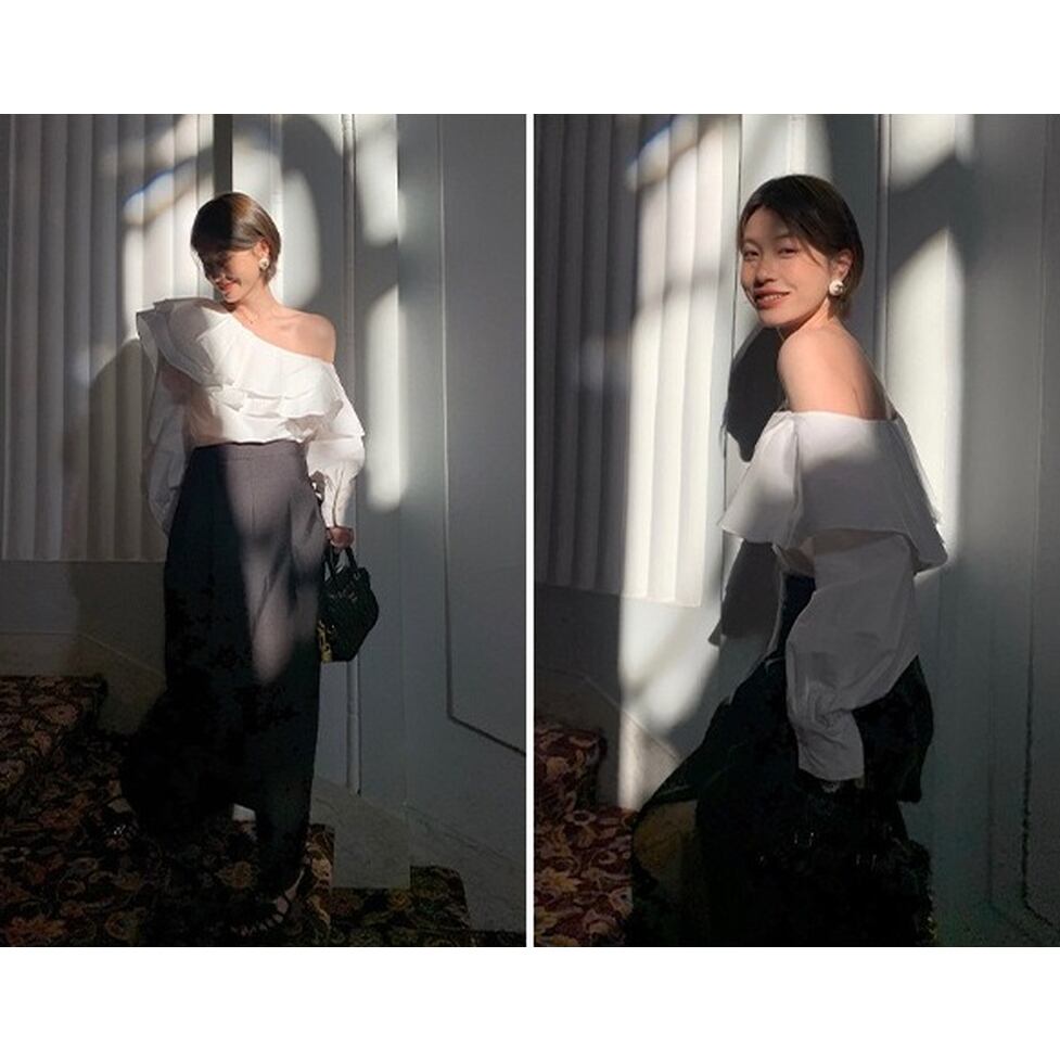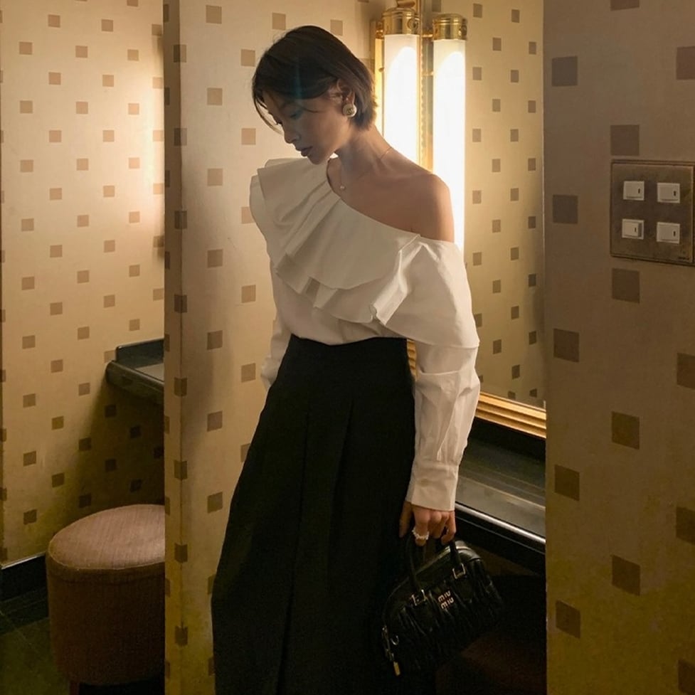 ワンショルで丁度いい肌見せで大人っぽく着こなせるブラウス。デコルテを美しく見せて360度キマるデザイン。大きめのフレンチフリルがコーデのアクセントにも。スラックスと合わせるとマニッシュな大人コーデの完成。マーメイドスカートやタイトスカートでとことんレディライクにキメるのもおすすめ。これからの装いにキレをもたらす。