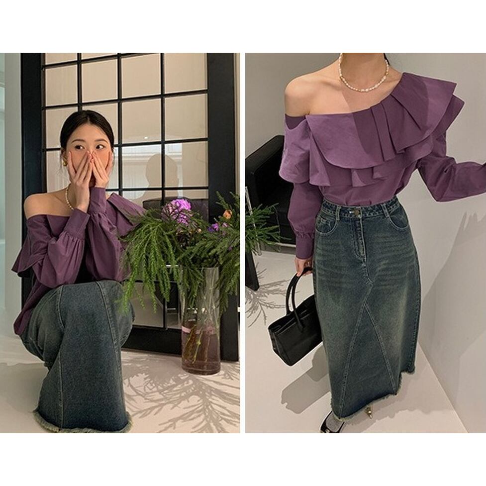 ブラウス トップス シャツ ワンショルダーブラウス オフショルダーラッフルブラウス フレンチフリルオフショルブラウス フリル 長袖 ワンショルダー 肩だし 無地 フレア レディース かわいい 大人可愛い おしゃれ ガーリー エレガント キュート きれいめ 上品 お出かけ ショッピング 休日 デート 女子会 イベント 旅行 体型カバー ゆったり スタイルUP デイリー 万能 普段使い フェミニン シンプル スタイリッシュ 高見え 鮮度アップ