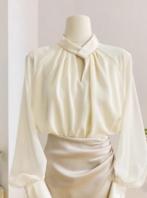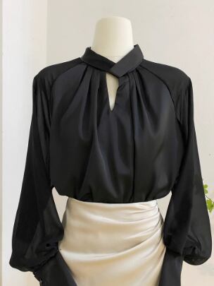 とろみ素材が魅せる抜け感シルエットのブラウス。