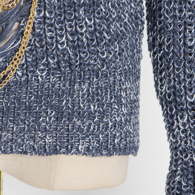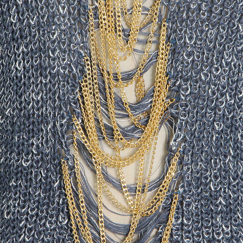 さりげないダメージデザインが目を引く、細身シルエットのラウンドネックニット。タイトなラインが女性らしさを引き立てながら、程よい抜け感でこなれた印象に仕上げます。ブルーの無地デザインがクールで、大人カジュアルにもぴったり。