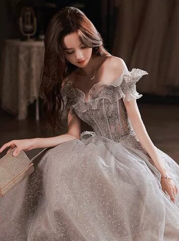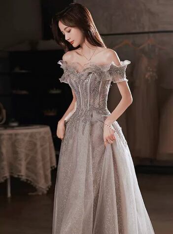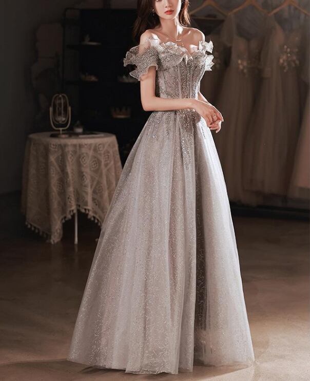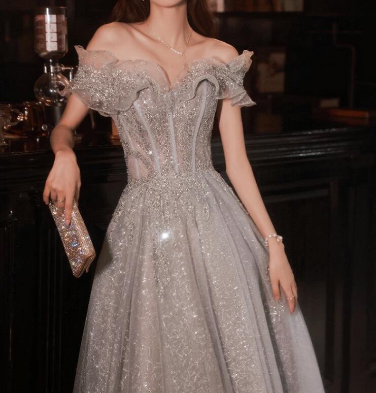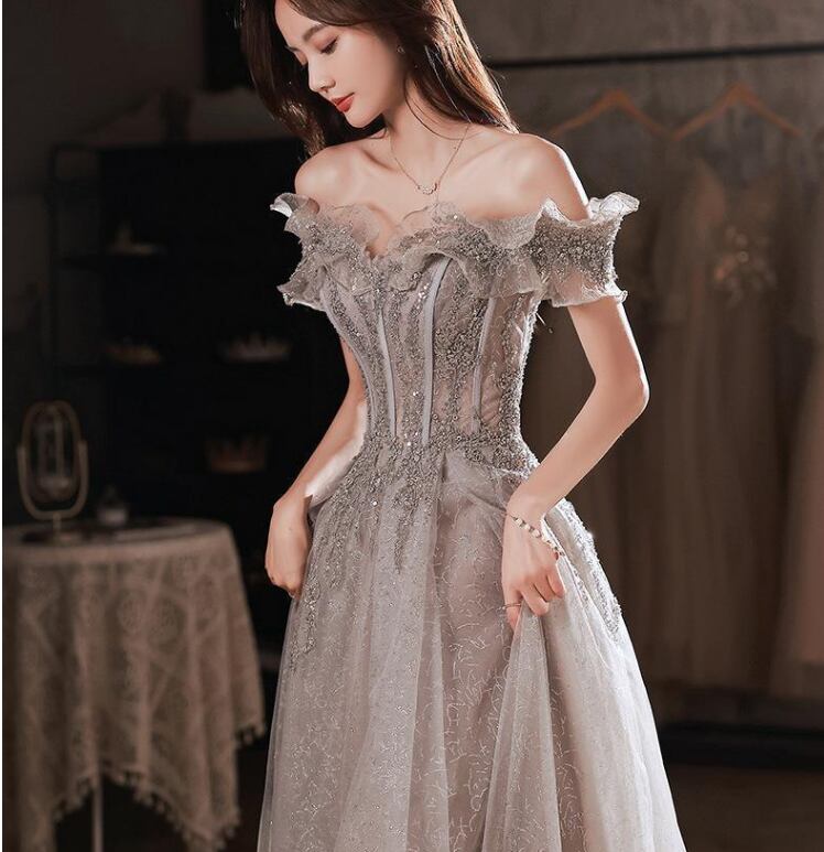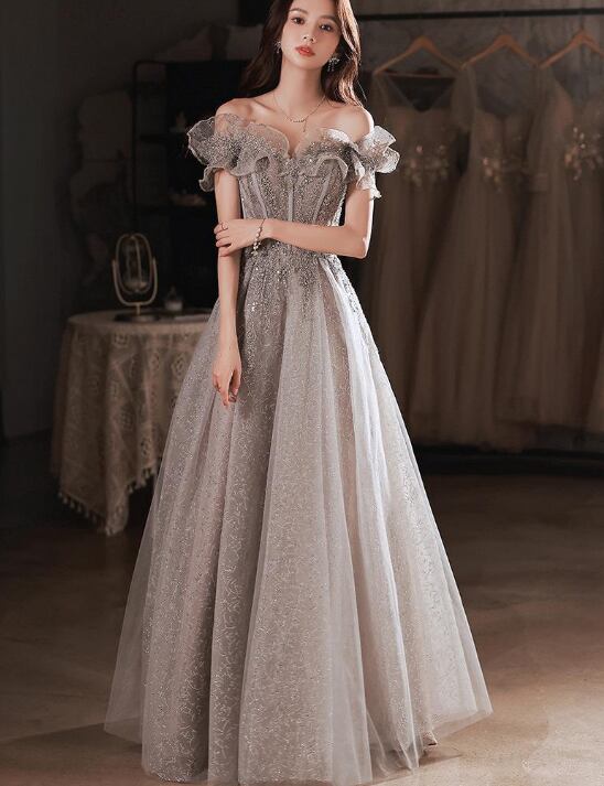 レディース パーティードレス ロング 半袖 オフショルダー 襟なし Aライン 背中開き フリル 大人可愛い きれいめ 上品 おしゃれ 個性的 エレガント 主役級 存在感 ラブリー キュート プリンセス 都会的 ラグジュアリー ロマンティック ナチュラル 総柄 オールシーズン シーズンレス パーティー イベント 美脚 脚長 モテ 清楚 トレンド 流行 インスタ映え 定番 スタイルアップ セクシー S M L XL 2XL 3XL 4XL 5XL 6XL サイズ豊富 グレー ベーシックカラー 大人カラー