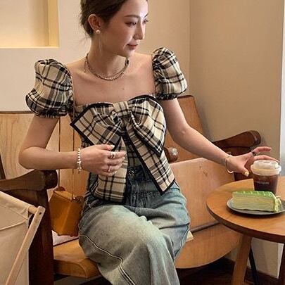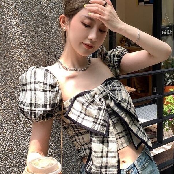 トップス ブラウス 半袖 パフスリーブ スクエアネック プルオーバー ショート丈 リボン 可愛い かわいい 大人可愛い きれいめ シンプル 上品 おしゃれ レトロ かっこいい カジュアル こなれ感 個性的 主役級 存在感 抜け感 春 夏 ベーシック ナチュラル フェミニン ガーリー キュート チェック柄 女性用 レディース ママ OL 通勤 オフィス 学生 通学 デート お出かけ お泊まり 女子会 旅行 カフェ ショッピング コンパ 普段使い デイリー イベント 着回し S M L トレンド モテ