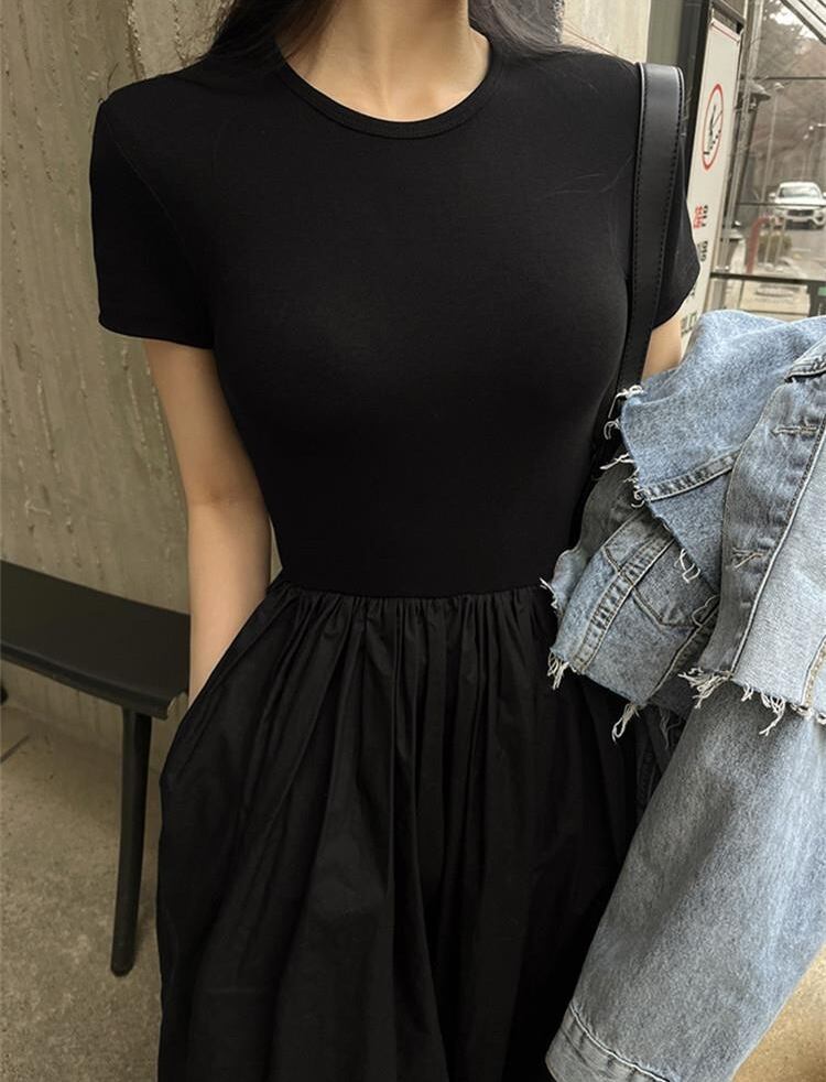ワンピース ロングワンピース 半袖 クルーネック ハイウエスト 切り替えデザイン 異素材ミックス 可愛い かわいい 大人可愛い きれいめ シンプル 上品 おしゃれ レトロ かっこいい カジュアル こなれ感 個性的 主役級 存在感 抜け感 ナチュラル ベーシック エレガント キュート 無地 女性用 レディース ママ OL 通勤 学生 通学 デート お出かけ お泊まり 女子会 旅行 休日 カフェ ショッピング コンパ 普段使い デイリー イベント 着回し 重ね着 脚長 S M L XL トレンド モテ