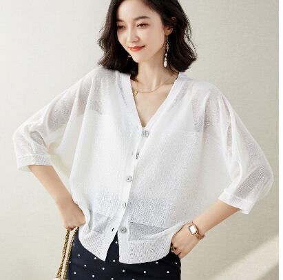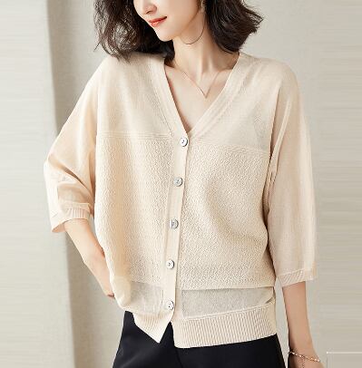 軽やかな透け感と薄手のサマーニット素材が魅力のVネックカーディガン。