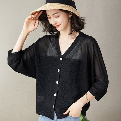 レディース トップス カーディガン サマーニット 羽織 前開き 普通丈 7分袖 Vネック 襟なし フェミニン 透け感 薄手 きれいめ シンプル カジュアル 上品 おしゃれ こなれ感 ラフ 主役級 存在感 ベーシック ナチュラル 無地 春 夏 デート お出かけ 女子会 ショッピング カフェ 重ね着 普段使い 着回し モテ 清楚 トレンド 流行 インスタ映え 定番 スタイルアップ 日焼け防止 フリーサイズ ワンサイズ ホワイト ブラック ピンク ブルー アプリコット ライトブルー ベーシックカラー 大人カラー