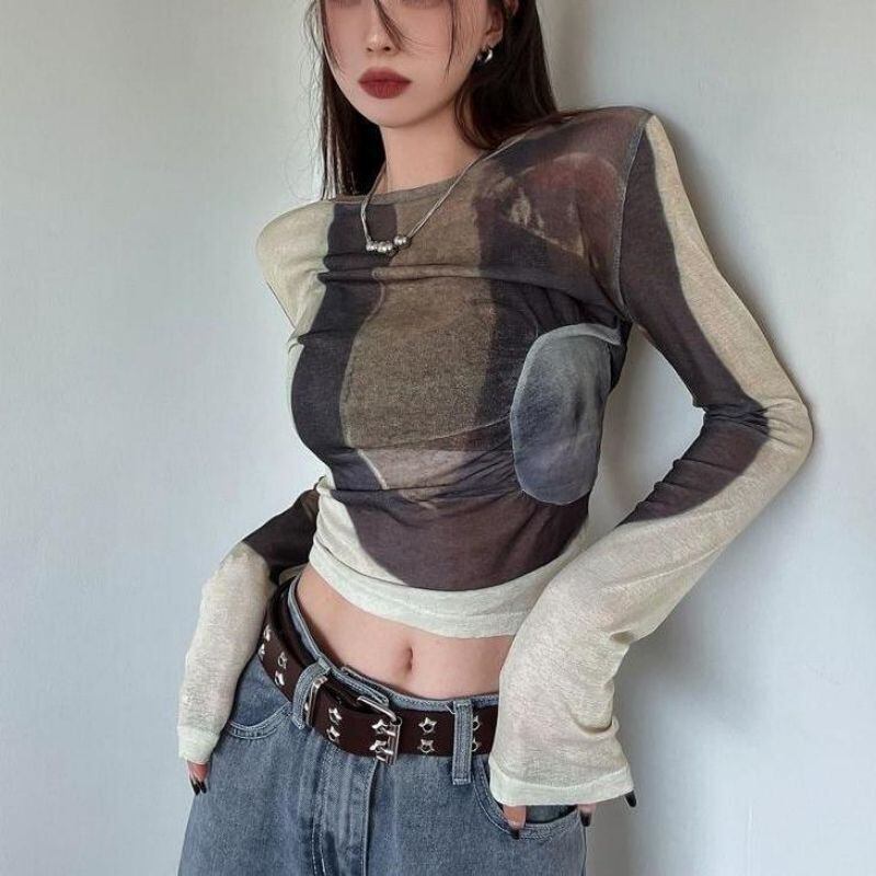 レディース トップス ロンT ショート 長袖 レギュラースリーブ ラウンドネック タイト スリム シフォン 透け感 カラーブロック 日焼け防止 薄手 シアー ポリエステル シンプル カジュアル おしゃれ タイダイ 春 秋 デート お出かけ アウトドア キャンプ イベント リゾート 休日 バカンス ガーデン ショッピング 発表会 コンサート ライブ カフェ フリーサイズ ブラウン
