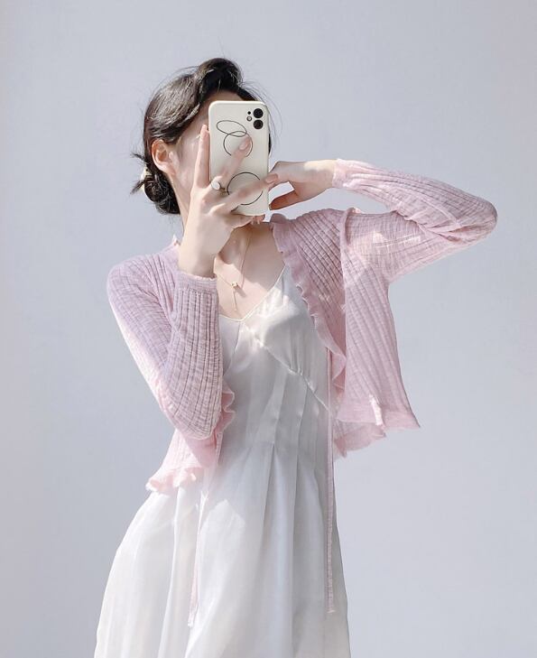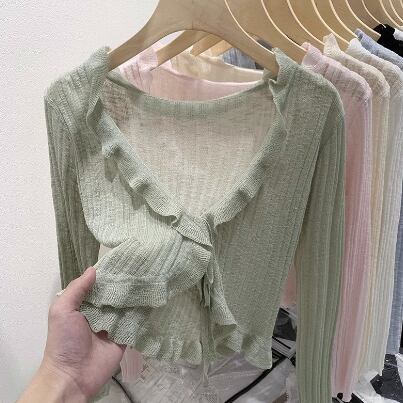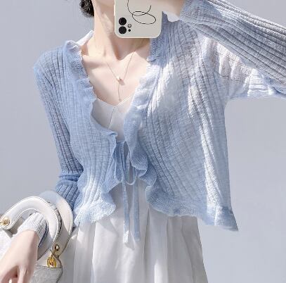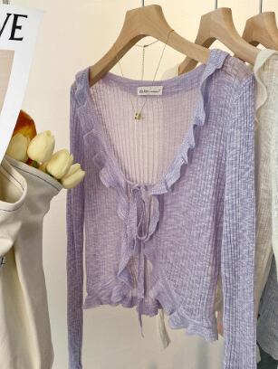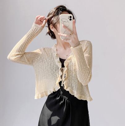 レディース トップス カーディガン 羽織 ショート丈 長袖 Vネック 襟なし フェミニン フリル 透け感 シースルー 大人可愛い きれいめ シンプル カジュアル 上品 おしゃれ こなれ感 エレガント 主役級 存在感 都会的 ベーシック ナチュラル 無地 春 夏 デート お出かけ ショッピング カフェ 普段使い 着回し モテ 清楚 トレンド 流行 インスタ映え 定番 スタイルアップ S M L ホワイト ブラック ピンク ブルー アプリコット グリーン ベーシックカラー 大人カラー パープル カラバリ