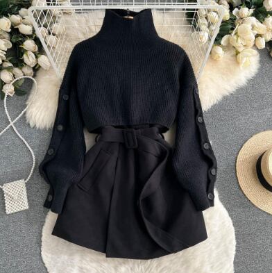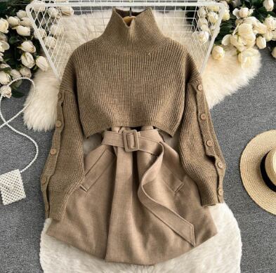 春や秋のお出かけにぴったりな、カジュアルでありながらおしゃれなツーピーススーツです。長袖のニットセーターの組み合わせで、温かみのあるスタイルを楽しめます。ボタンダウン袖が、さりげないアクセント。