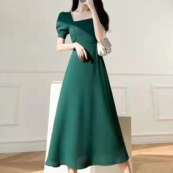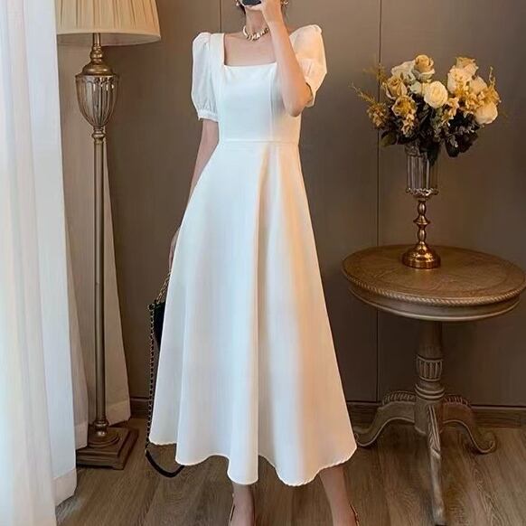 ドレス 衣装 カクテルドレス ミモレ丈ドレス 半袖 パフスリーブ スクエアネック ハイウエスト Aラインスカート ミモレ丈 ステージドレス 発表会 かわいい 大人可愛い きれいめ シンプル 上品 おしゃれ かっこいい レトロ こなれ感 個性的 主役級 存在感 抜け感 オールシーズン ロングシーズン シーズンレス エレガント 華やか ゴージャス 無地 レディース 女性用 ママ 結婚式 披露宴 パーティー ディナー 二次会 ホテル イベント 脚長 S M L XL 2XL トレンド モテ 高見え 高級感