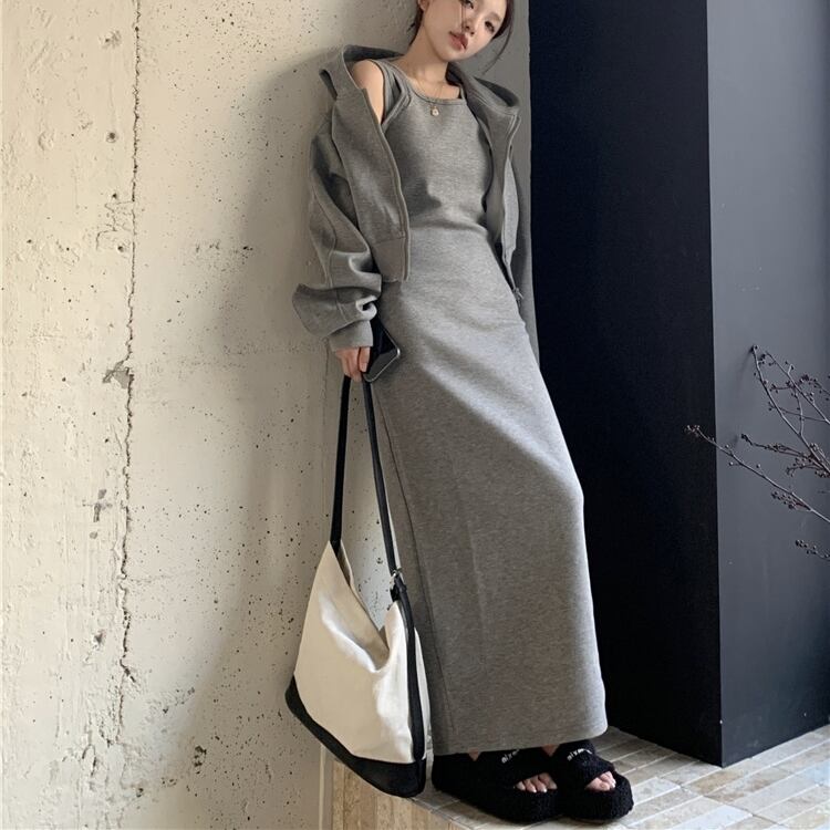 2点セット セットアップ ノースリーブワンピース Uネック ロング丈 パーカー 長袖 ショート丈 前開き ファスナー 可愛い かわいい 大人可愛い きれいめ シンプル 上品 おしゃれ レトロ かっこいい カジュアル こなれ感 個性的 主役級 存在感 抜け感 秋 冬 ベーシック ナチュラル メンズライク 無地 女性用 レディース OL 通勤 オフィス 学生 通学 デート お出かけ お泊まり 女子会 旅行 カフェ ショッピング 普段使い デイリー イベント 着回し 重ね着 脚長 S M L トレンド モテ