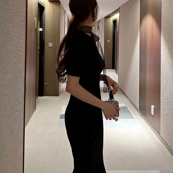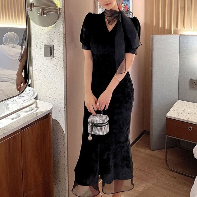 ドレス 衣装 ミモ丈スワンピース 半袖 Vネック パフスリーブ ミモレ丈 ハイウエスト マーメードスカート ミモレ丈 シースルー ステージドレス 発表会 かわいい 大人可愛い きれいめ シンプル 上品 おしゃれ かっこいい レトロ こなれ感 個性的 主役級 存在感 抜け感 オールシーズン ロングシーズン シーズンレス エレガント 華やか ゴージャス 無地 レディース 女性用 ママ 結婚式 披露宴 パーティー ディナー 二次会 ホテル イベント 脚長 美脚 S M L XL トレンド モテ 高見え 高級感