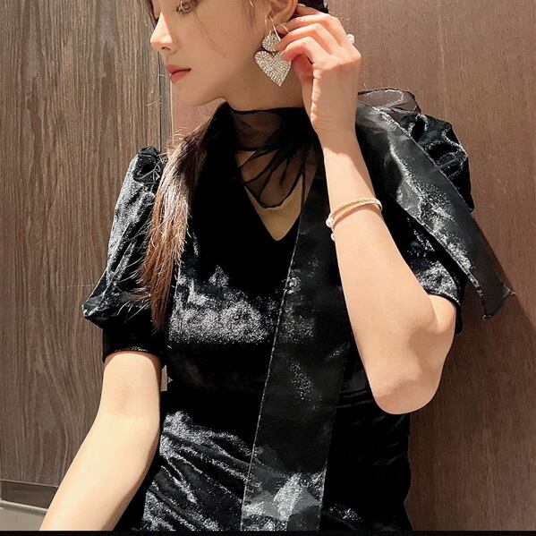 上品なVネックとパフスリーブが大人可愛い印象を与え、女性らしさを引き立てる一着です。