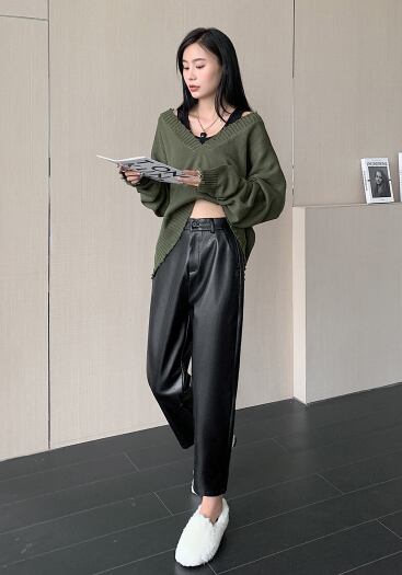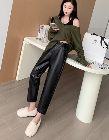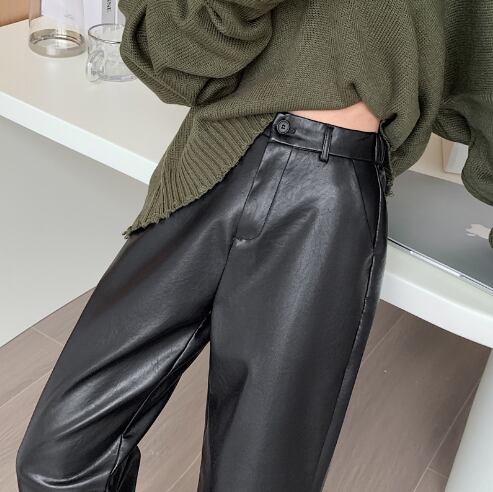 ■シンプルで都会的なデザインのレザーパンツ!ハイウエストのスタイルが脚長効果を引き出し、大人可愛い印象を与えてくれます。ポケット付きで実用性も兼ね備え、通勤やデート、コンサートなど様々なシーンで活躍するアイテムです。無地のカラーは使い回しが効き、春のおしゃれを楽しむのにぴったりです!