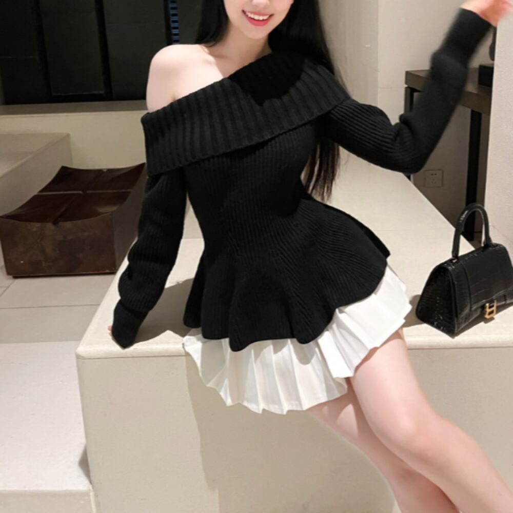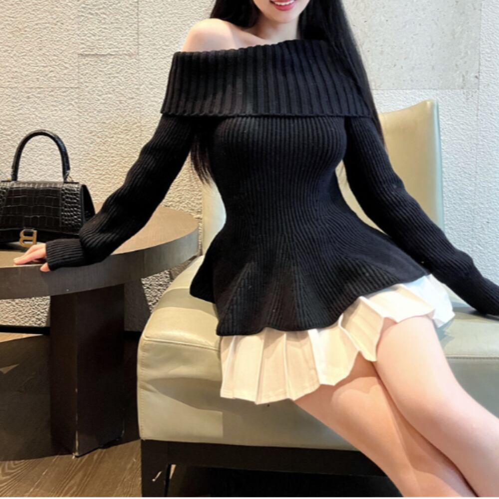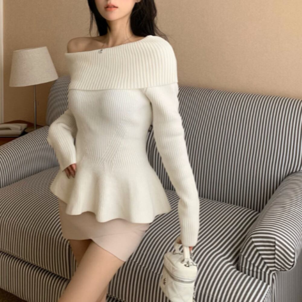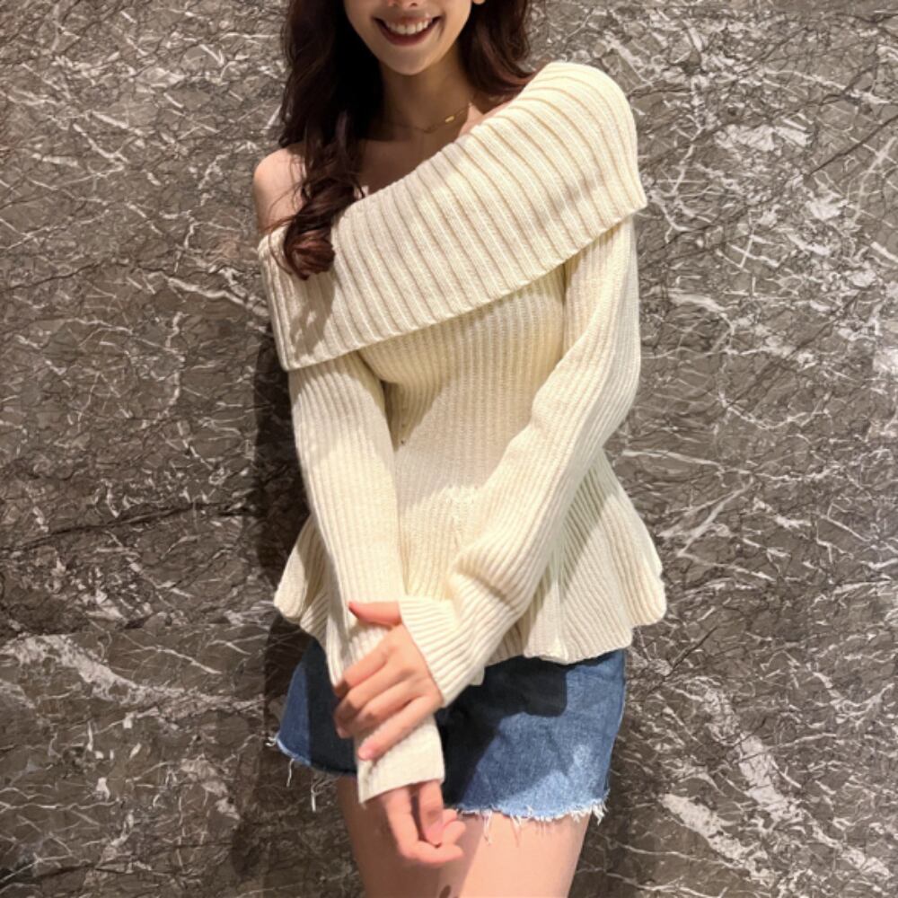 レディース トップス ニット セーター レギュラー丈 長袖 レギュラースリーブ オフショルダー 襟なし タイト ストレート 厚手 ニット ポリエステル繊維 ビスコース繊維 シンプル おしゃれ 個性的 エレガント 存在感 シック スタイリッシュ 無地 秋 通勤 デート お出かけ パーティー イベント リゾート 旅行 レストラン 女子会 休日 バカンス ホテル ショッピング 発表会 コンサート カフェ 普段使い S M ブラック グレー オフホワイト