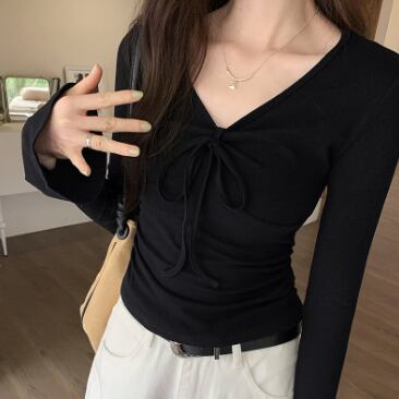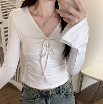 レディース トップス ロンT レギュラー丈 長袖 フレアスリーブ Vネック りぼんタイ タイト スリム 細身 フェミニン プリーツ レースアップ 薄手 アクリル繊維 かわいい 大人可愛い きれいめ シンプル 上品 おしゃれ 都会的 ナチュラル 無地 夏 授業参観 オフィス ビジネス OL 通勤 デート お出かけ お泊まり 海 プール レストラン ビーチ 公園 休日 コンサート ライブ 合コン コンパ カフェ 重ね着 楽ちん 普段使い 着回し 定番 S M L XL 白 黒 ピンク アプリコット