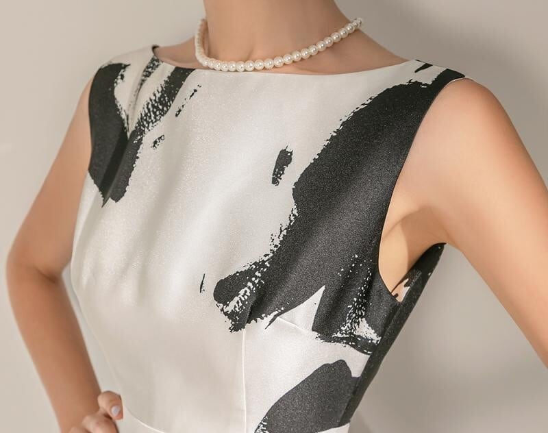 華やかなシーンにふさわしい、上品でエレガントなペイント柄ドレス。ボートネックとノースリーブのすっきりとしたデザインが、女性らしいラインを美しく引き立てます。Aラインシルエットが自然に広がり、歩くたびに優雅な揺れ感を演出します。