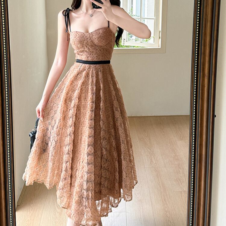 レディース スカート ワンピース フレアスカート ロングスカート ロング ノースリーブ 襟なし Aライン フェミニン プリーツ チュール ハイウエスト 透け感 薄手 ポリエステル かわいい 上品 おしゃれ 個性的 エレガント 存在感 花柄 夏 お出かけ パーティー イベント リゾート バカンス ホテル 発表会 コンサート S M L XL ベージュ